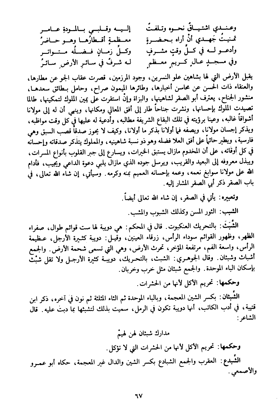 يقبل الأرض التي لها بشاهين علو النسرين، وجود المرزمين، قصرت عقاب الجو عن مطارها، والعنقاء ذات الحسن عن محاسن أخبارها، وطائرها الميمون صراح، وحامل بطائق سعدها، منشور الجناح، يعترف أبو الصقر لشاهينها، والبزاة وإن استقرت على يمين الملوك لتمكينها، طالما تصيدت الملوك بإحسانها، ونشرت جناحا طار إلى أفق المعالي ومكانها، وينهي أن له إلى مولانا أشواقا غالبه، وعينا برؤيته في تلك البقاع الشريفة مطالبه، وأدعية له عليها في كل وقت مواظبه، ويذكر إجسان مولانا، ويصفه فما أولانا بذكر ما أولانا، وكيف لا يجوز صدقا قصب السبق وهي فارسية، ويطير حائما على أفق العلا فضله وهو ذو نسبة شاهينيه، والمملوك يتذكر صدقاته وإحسانه في كل أوقاته، على أن المخدوم مازال يستبق الخيرات، ويسارع إلى جبر القلوب بأنواع المسرات، ويبذل معروفه إلى البعيد والقريب، ويرسل جوده الذي ما زال يلبي دعوة الداعي ويجيب، فأدام الله على مولانا سوابغ نعمه، وعمه بإحسانه العميم بمنه وكرمه. وسيأتي، إن شاء الله تعالى، في باب الصقر ذكر أبي الصقر المشار إليه.