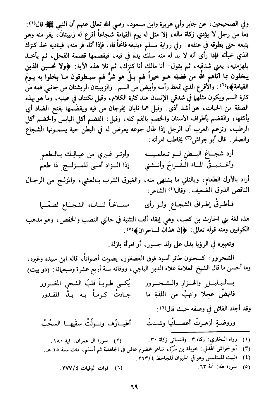 » «2» : والأقرع الذي تمعط رأسه وأبيض من السم. والزبيبتان الريشتان من جانبي فمه من كثرة السم ويكون مثلهما في شدقي الإنسان عند كثرة الكلام، وقيل نكتتان في عينيه، وما هو بهذه الصفة من الحيات، هو أشد أذى. وقيل هما نابان يخرجان من فيه ويقضمها بفتح الضاد أي يأكلها، والقضم بأطراف الأسنان والخضم بالفم كله، وقيل: القضم أكل اليابس والخضم أكل الرطب، وتزعم العرب أن الرجل إذا طال جوعه يعرض له في البطن حية يسمونها الشجاع والصفر. قال أبو خراش «3» يخاطب امرأته: