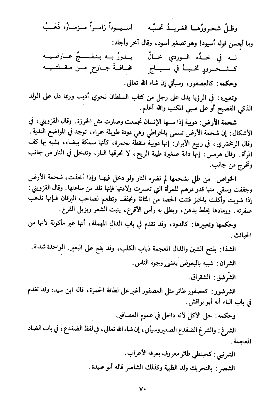 وقال الزمخشري، في ربيع الأبرار: إنها دويبة منقطة بحمرة، كأنها سمكة بيضاء، يشبه بها كف المرأة. وقال هرمس: إنها دابة صغيرة طيبة الريح، لا تحرقها النار، وتدخل في النار من جانب وتخرج من جانب.