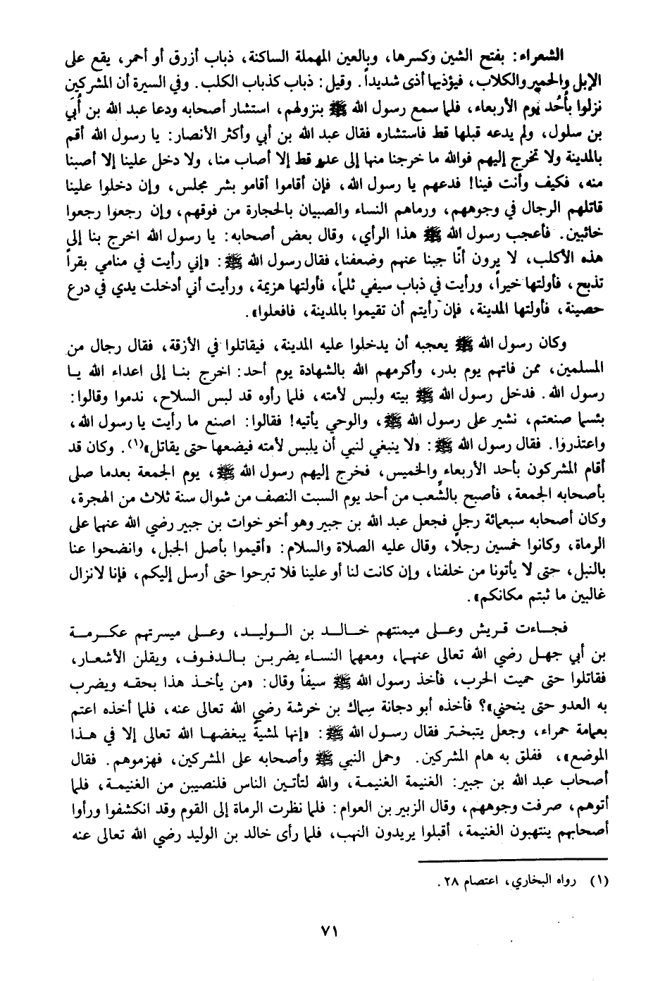 بفتح الشين وكسرها، وبالعين المهملة الساكنة، ذباب أزرق أو أحمر، يقع على الإبل والحمير والكلاب، فيؤذيها أذى شديدا. وقيل: ذباب كذباب الكلب. وفي السيرة أن المشركين نزلوا بأحد يوم الأربعاء، فلما سمع رسول الله صلى الله عليه وسلم بنزولهم، استشار أصحابه ودعا عبد الله بن أبي بن سلول، ولم يدعه قبلها قط فاستشاره فقال عبد الله بن أبي وأكثر الأنصار: يا رسول الله أقم بالمدينة ولا تخرج إليهم فو الله ما خرجنا منها إلى عدو قط إلا أصاب منا، ولا دخل علينا إلا أصبنا منه، فكيف وأنت فينا! فدعهم يا رسول الله، فإن أقاموا أقامو بشر مجلس، وإن دخلوا علينا قاتلهم الرجال في وجوههم، ورماهم النساء والصبيان بالحجارة من فوقهم، وإن رجعوا رجعوا خائبين. فأعجب رسول الله صلى الله عليه وسلم هذا الرأي، وقال بعض أصحابه: يا رسول الله اخرج بنا إلى هذه الأكلب، لا يرون أنّا جبنا عنهم وضعفنا، فقال رسول الله صلى الله عليه وسلم: «إني رأيت في منامي بقرا تذبح، فأولتها خيرا، ورأيت في ذباب سيفي ثلما، فأولتها هزيمة، ورأيت أني أدخلت يدي في درع حصينة، فأولتها المدينة، فإن رأيتم أن تقيموا بالمدينة، فافعلوا» .