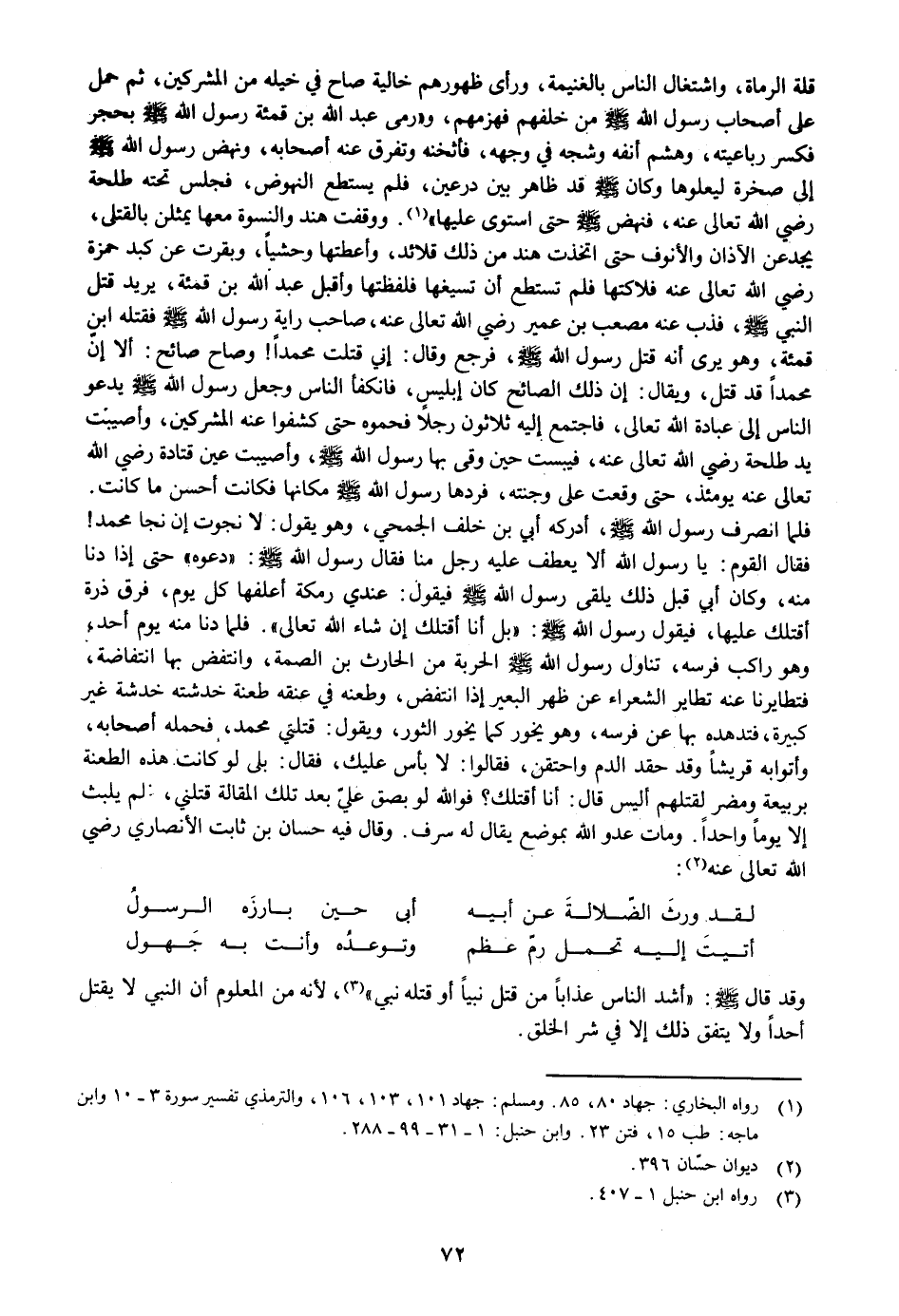 قلة الرماة، واشتغال الناس بالغنيمة، ورأى ظهورهم خالية صاح في خيله من المشركين، ثم حمل على أصحاب رسول الله صلى الله عليه وسلم من خلفهم فهزمهم، و «رمى عبد الله بن قمئة رسول الله صلى الله عليه وسلم بحجر فكسر رباعيته، وهشم أنفه وشجه في وجهه، فأثخنه وتفرق عنه أصحابه، ونهض رسول الله صلى الله عليه وسلم إلى صخرة ليعلوها وكان صلى الله عليه وسلم قد ظاهر بين درعين، فلم يستطع النهوض، فجلس تحته طلحة رضي الله تعالى عنه، فنهض صلى الله عليه وسلم حتى استوى عليها» «1» . ووقفت هند والنسوة معها يمثلن بالقتلى، يجدعن الآذان والأنوف حتى اتخذت هند من ذلك قلائد، وأعطتها وحشيا، وبقرت عن كبد حمزة رضي الله تعالى عنه فلاكتها فلم تستطع أن تسيغها فلفظتها وأقبل عبد الله بن قمئة، يريد قتل النبي صلى الله عليه وسلم، فذب عنه مصعب بن عمير رضي الله تعالى عنه، صاحب راية رسول الله صلى الله عليه وسلم فقتله ابن قمئة، وهو يرى أنه قتل رسول الله صلى الله عليه وسلم، فرجع وقال: إني قتلت محمدا! وصاح صائح: ألا إن محمدا قد قتل، ويقال: إن ذلك الصائح كان إبليس، فانكفأ الناس وجعل رسول الله صلى الله عليه وسلم يدعو الناس إلى عبادة الله تعالى، فاجتمع إليه ثلاثون رجلا فحموه حتى كشفوا عنه المشركين، وأصيبت يد طلحة رضي الله تعالى عنه، فيبست حين وقى بها رسول الله صلى الله عليه وسلم، وأصيبت عين قتادة رضي الله تعالى عنه يومئذ، حتى وقعت على وجنته، فردها رسول الله صلى الله عليه وسلم مكانها فكانت أحسن ما كانت.