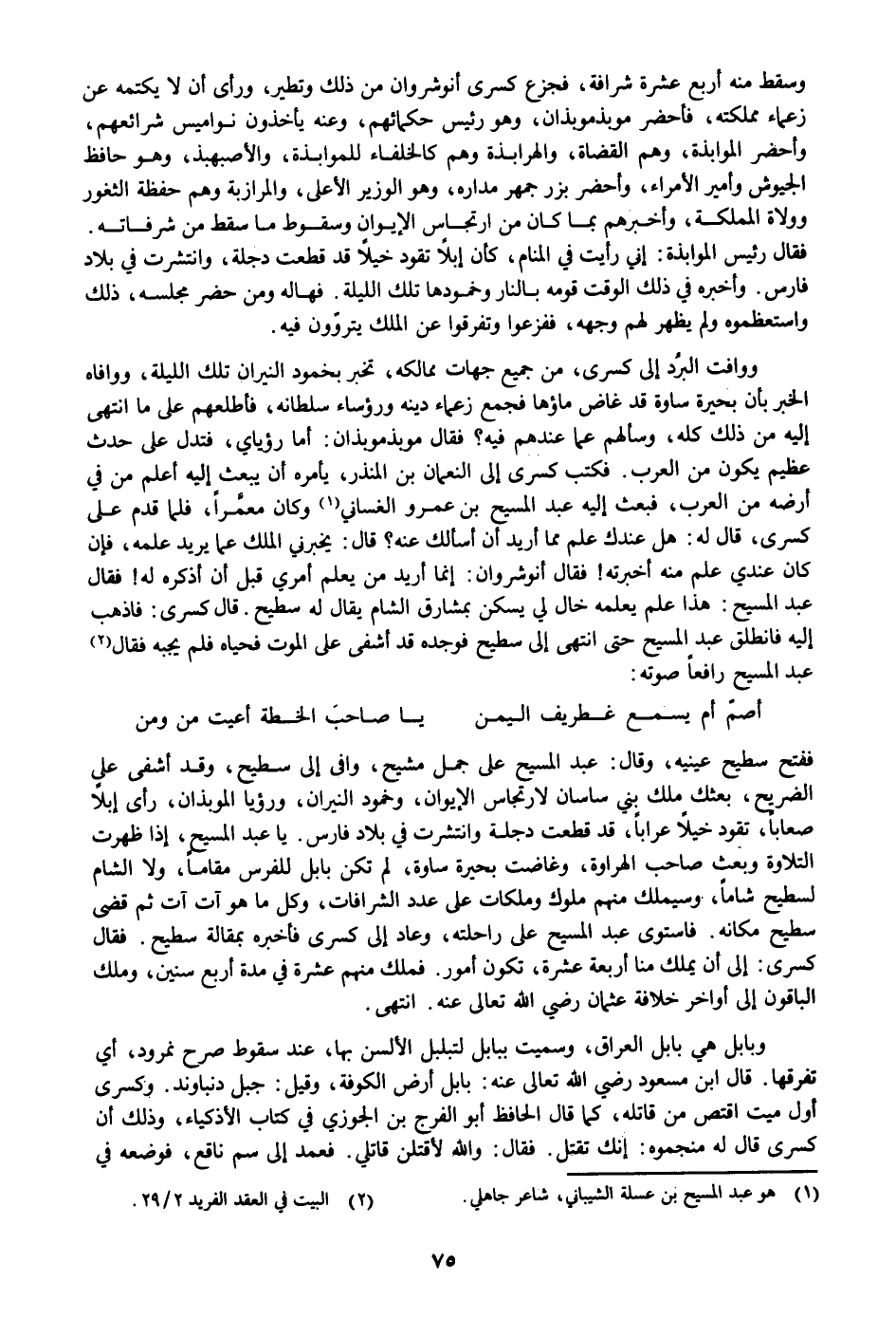 ففتح سطيح عينيه، وقال: عبد المسيح على جمل مشيح، وافى إلى سطيح، وقد أشفى على الضريح، بعثك ملك بني ساسان لارتجاس الإيوان، وخمود النيران، ورؤيا الموبذان، رأى إبلا صعابا، تقود خيلا عرابا، قد قطعت دجلة وانتشرت في بلاد فارس. يا عبد المسيح، إذا ظهرت التلاوة وبعث صاحب الهراوة، وغاضت بحيرة ساوة، لم تكن بابل للفرس مقاما، ولا الشام لسطيح شاما، وسيملك منهم ملوك وملكات على عدد الشرافات، وكل ما هو آت آت ثم قضى سطيح مكانه. فاستوى عبد المسيح على راحلته، وعاد إلى كسرى فأخبره بمقالة سطيح. فقال كسرى: إلى أن يملك منا أربعة عشرة، تكون أمور. فملك منهم عشرة في مدة أربع سنين، وملك الباقون إلى أواخر خلافة عثمان رضي الله تعالى عنه. انتهى.