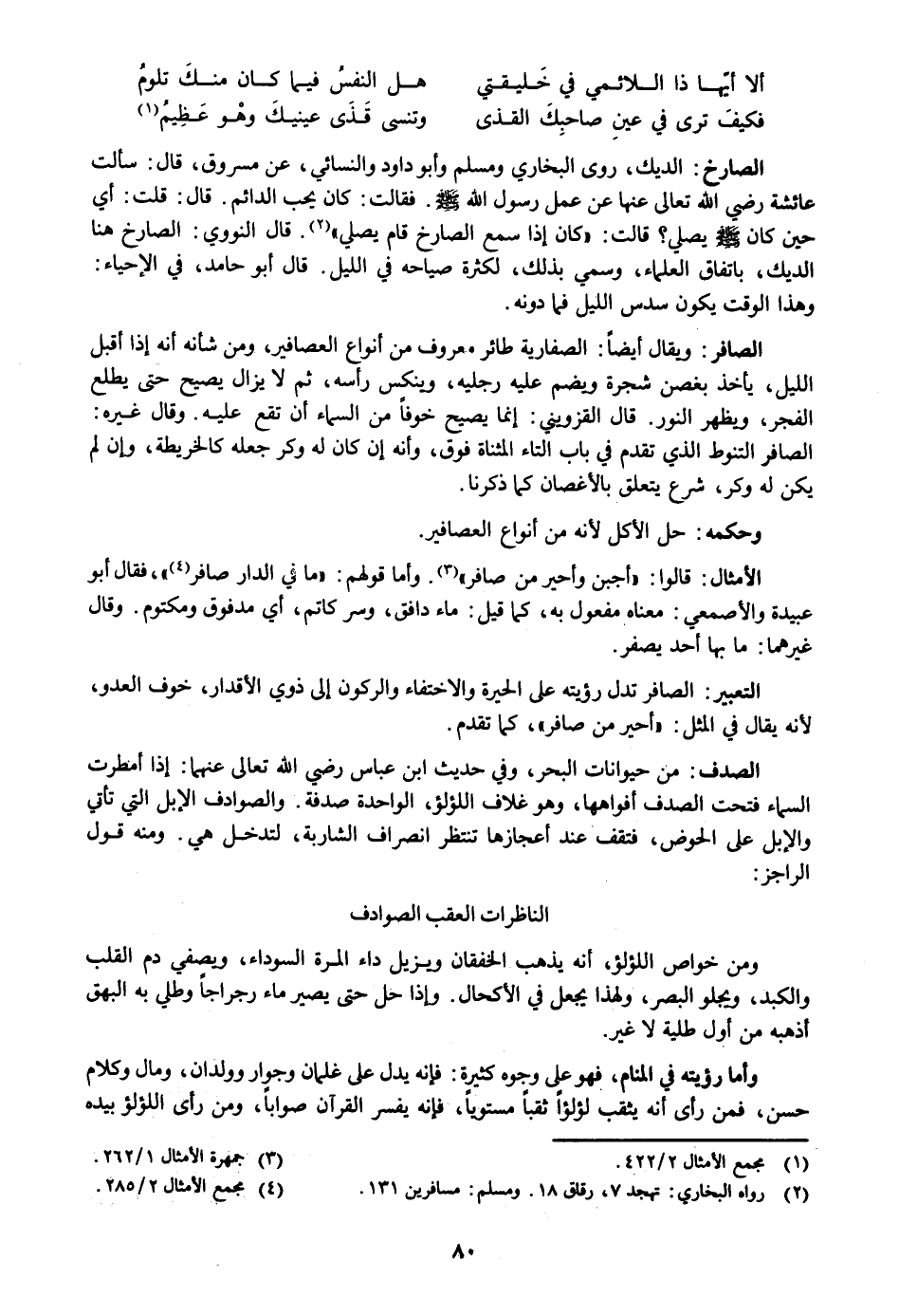 الديك، روى البخاري ومسلم وأبو داود والنسائي، عن مسروق، قال: سألت عائشة رضي الله تعالى عنها عن عمل رسول الله صلى الله عليه وسلم. فقالت: كان يحب الدائم. قال: قلت: أي حين كان صلى الله عليه وسلم يصلي؟ قالت: «كان إذا سمع الصارخ قام يصلي» «2» . قال النووي: الصارخ هنا الديك، باتفاق العلماء، وسمي بذلك، لكثرة صياحه في الليل. قال أبو حامد، في الإحياء: