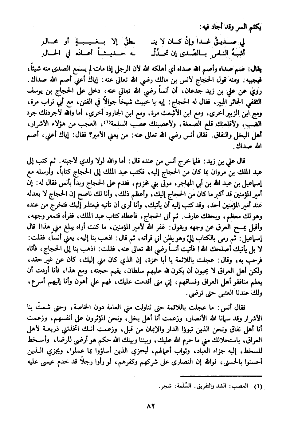 روي عن علي بن زيد جدعان، أن أنسا رضي الله تعالى عنه، دخل على الحجاج بن يوسف الثقفي الجائر المبير، فقال له الحجاج: إيه يا خبيث شيخا جوالا في الفتن، مع أبي تراب مرة، ومع ابن الزبير أخرى، ومع ابن الأشعث مرة، ومع ابن الجارود أخرى، أما والله لأجردنك جرد الضب، ولأقلعنك قلع الصمغة، ولأعصبنك عصب السلمة «1» ، العجب من هؤلاء الأشرار، أهل البخل والنفاق. فقال أنس رضي الله تعالى عنه: من يعني الأمير؟ فقال: إياك أعني، أصم الله صداك.