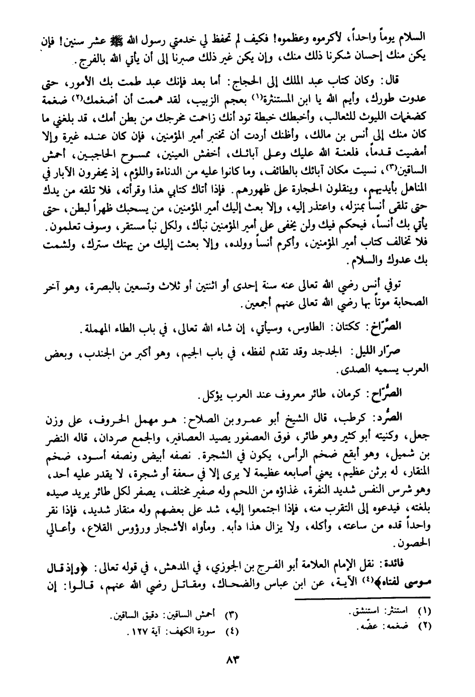 قال: وكان كتاب عبد الملك إلى الحجاج: أما بعد فإنك عبد طمت بك الأمور، حتى عدوت طورك، وأيم الله يا ابن المستنثرة «1» بعجم الزبيب، لقد هممت أن أضغمك «2» ضغمة كضغمات الليوث للثعالب، وأخبطك خبطة تود أنك زاحمت مخرجك من بطن أمك، قد بلغني ما كان منك إلى أنس بن مالك، وأظنك أردت أن تختبر أمير المؤمنين، فإن كان عنده غيرة وإلا أمضيت قدما، فلعنة الله عليك وعلى آبائك، أخفش العينين، ممسوح الحاجبين، أحمش الساقين «3» ، نسيت مكان آبائك بالطائف، وما كانوا عليه من الدناءة واللؤم، إذ يحفرون الآبار في المناهل بأيديهم، وينقلون الحجارة على ظهورهم. فإذا أتاك كتابي هذا وقرأته، فلا تلقه من يدك حتى تلقى أنسا بمنزله، واعتذر إليه، وإلا بعث إليك أمير المؤمنين، من يسحبك ظهرا لبطن، حتى يأتي بك أنسا، فيحكم فيك ولن يخفى على أمير المؤمنين نبأك، ولكل نبأ مستقر، وسوف تعلمون.