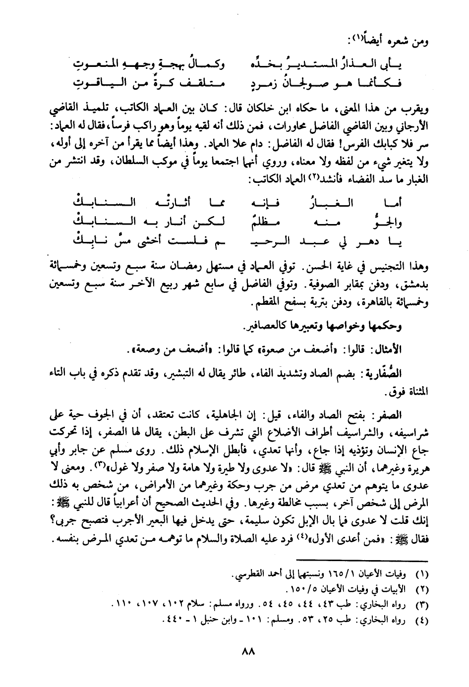 وهذا التجنيس في غاية الحسن. توفي العماد في مستهل رمضان سنة سبع وتسعين وخمسمائة بدمشق، ودفن بمقابر الصوفية. وتوفي الفاضل في سابع شهر ربيع الآخر سنة سبع وتسعين وخمسمائة بالقاهرة، ودفن بتربة بسفح المقطم.