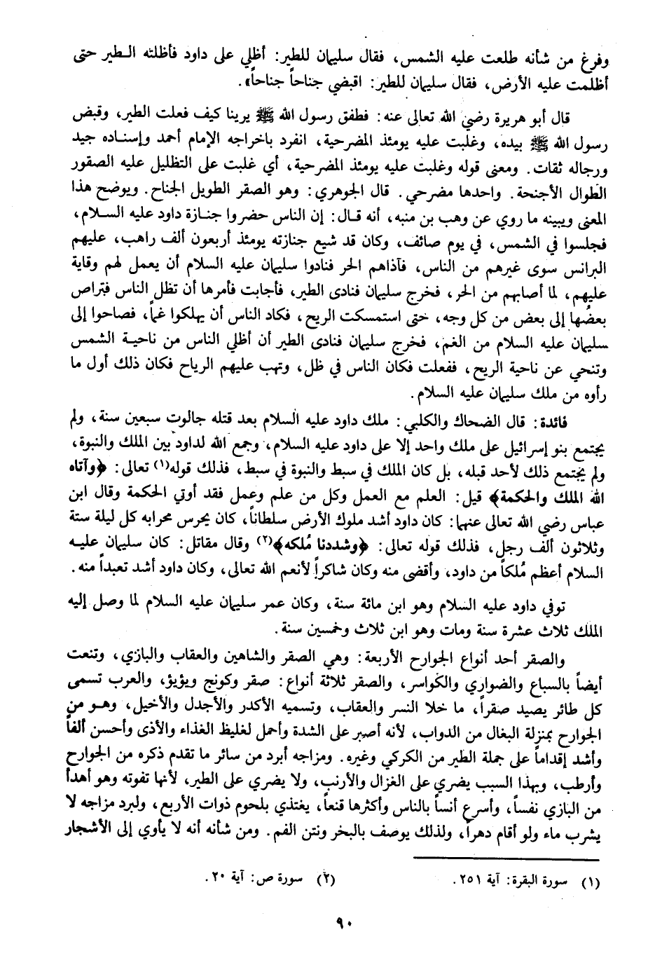 وفرغ من شأنه طلعت عليه الشمس، فقال سليمان للطير: أظلي على داود فأظلته الطير حتى أظلمت عليه الأرض، فقال سليمان للطير: اقبضي جناحا جناحا» .