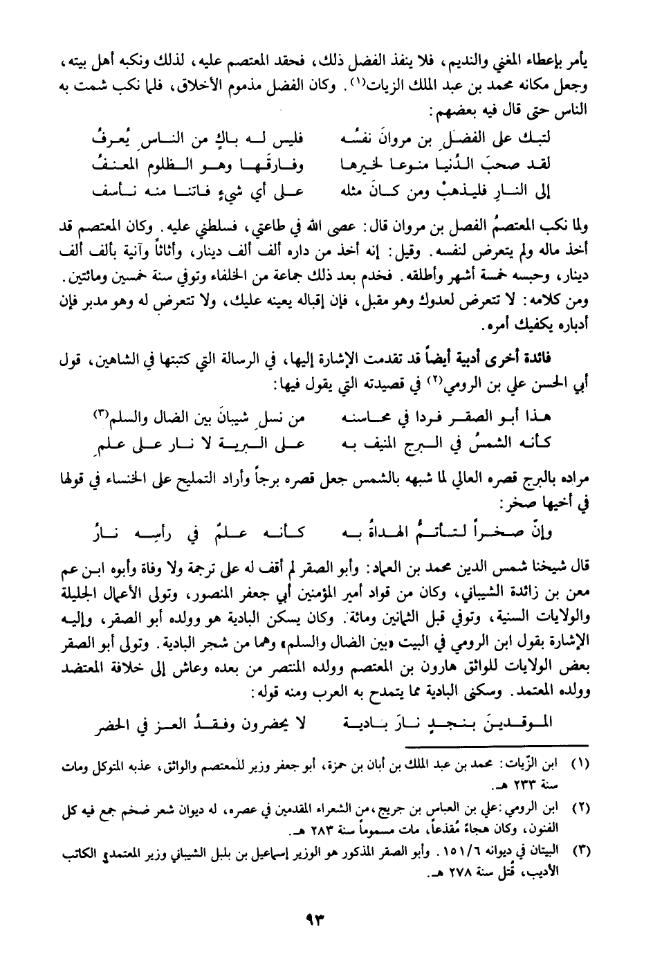 يأمر بإعطاء المغني والنديم، فلا ينفذ الفضل ذلك، فحقد المعتصم عليه، لذلك ونكبه أهل بيته، وجعل مكانه محمد بن عبد الملك الزيات «1» . وكان الفضل مذموم الأخلاق، فلما نكب شمت به الناس حتى قال فيه بعضهم: