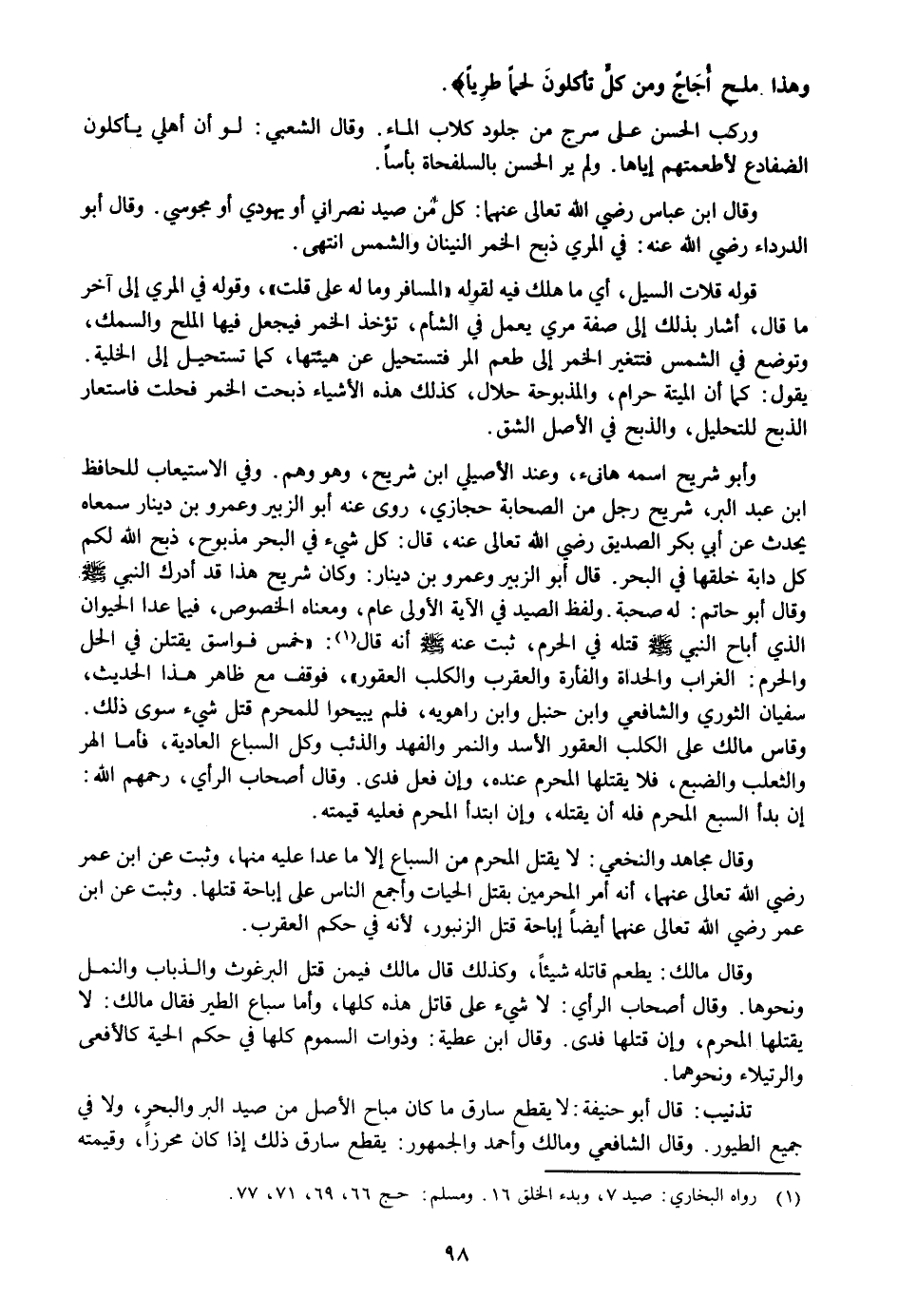 وأبو شريح اسمه هانىء، وعند الأصيلي ابن شريح، وهو وهم. وفي الاستيعاب للحافظ ابن عبد البر، شريح رجل من الصحابة حجازي، روى عنه أبو الزبير وعمرو بن دينار سمعاه يحدث عن أبي بكر الصديق رضي الله تعالى عنه، قال: كل شيء في البحر مذبوح، ذبح الله لكم كل دابة خلقها في البحر. قال أبو الزبير وعمرو بن دينار: وكان شريح هذا قد أدرك النبي صلى الله عليه وسلم وقال أبو حاتم: له صحبة. ولفظ الصيد في الآية الأولى عام، ومعناه الخصوص، فيما عدا الحيوان الذي أباح النبي صلى الله عليه وسلم قتله في الحرم، ثبت عنه صلى الله عليه وسلم أنه قال «1» : «خمس فواسق يقتلن في الحل والحرم: الغراب والحداة والفأرة والعقرب والكلب العقور» ، فوقف مع ظاهر هذا الحديث، سفيان الثوري والشافعي وابن حنبل وابن راهويه، فلم يبيحوا للمحرم قتل شيء سوى ذلك.