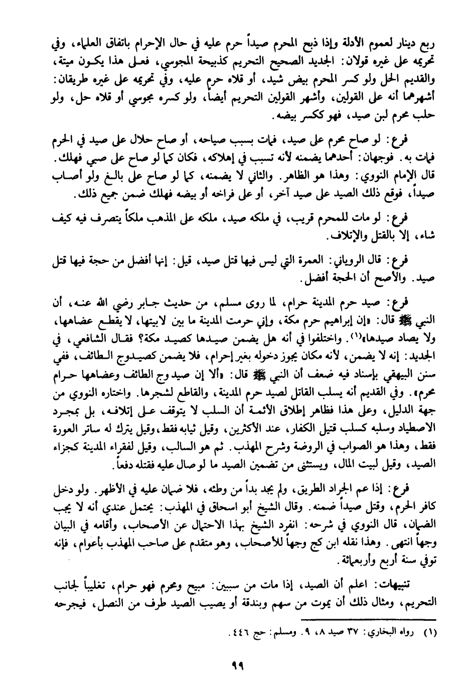 : صيد حرم المدينة حرام، لما روى مسلم، من حديث جابر رضي الله عنه، أن النبي صلى الله عليه وسلم قال: «إن إبراهيم حرم مكة، وإني حرمت المدينة ما بين لا بيتها، لا يقطع عضاهها، ولا يصاد صيدها» «1» . واختلفوا في أنه هل يضمن صيدها كصيد مكة؟ فقال الشافعي، في الجديد: إنه لا يضمن، لأنه مكان يجوز دخوله بغير إحرام، فلا يضمن كصيدوج الطائف، ففي سنن البيهقي بإسناد فيه ضعف أن النبي صلى الله عليه وسلم قال: «ألا إن صيدوج الطائف وعضاهها حرام محرم» . وفي القديم أنه يسلب القاتل لصيد حرم المدينة، والقاطع لشجرها. واختاره النووي من جهة الدليل، وعلى هذا فظاهر إطلاق الأئمة أن السلب لا يتوقف على إتلافه، بل بمجرد الاصطياد وسلبه كسلب قتيل الكفار، عند الأكثرين، وقيل ثيابه فقط، وقيل يترك له ساتر العورة فقط، وهذا هو الصواب في الروضة وشرح المهذب. ثم هو السالب، وقيل لفقراء المدينة كجزاء الصيد، وقيل لبيت المال، ويستثنى من تضمين الصيد ما لو صال عليه فقتله دفعا.