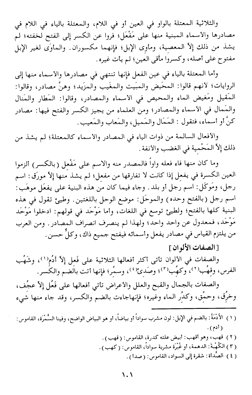 والصفات في الألوان تأتي أكثر أفعالها الثلاثية على فَعِل إلا أَدُمِ وشَهُب الفرس، وقِهُب، وكهب وصدىء، وسمُِر فإنها أتت بالضم والكسر.