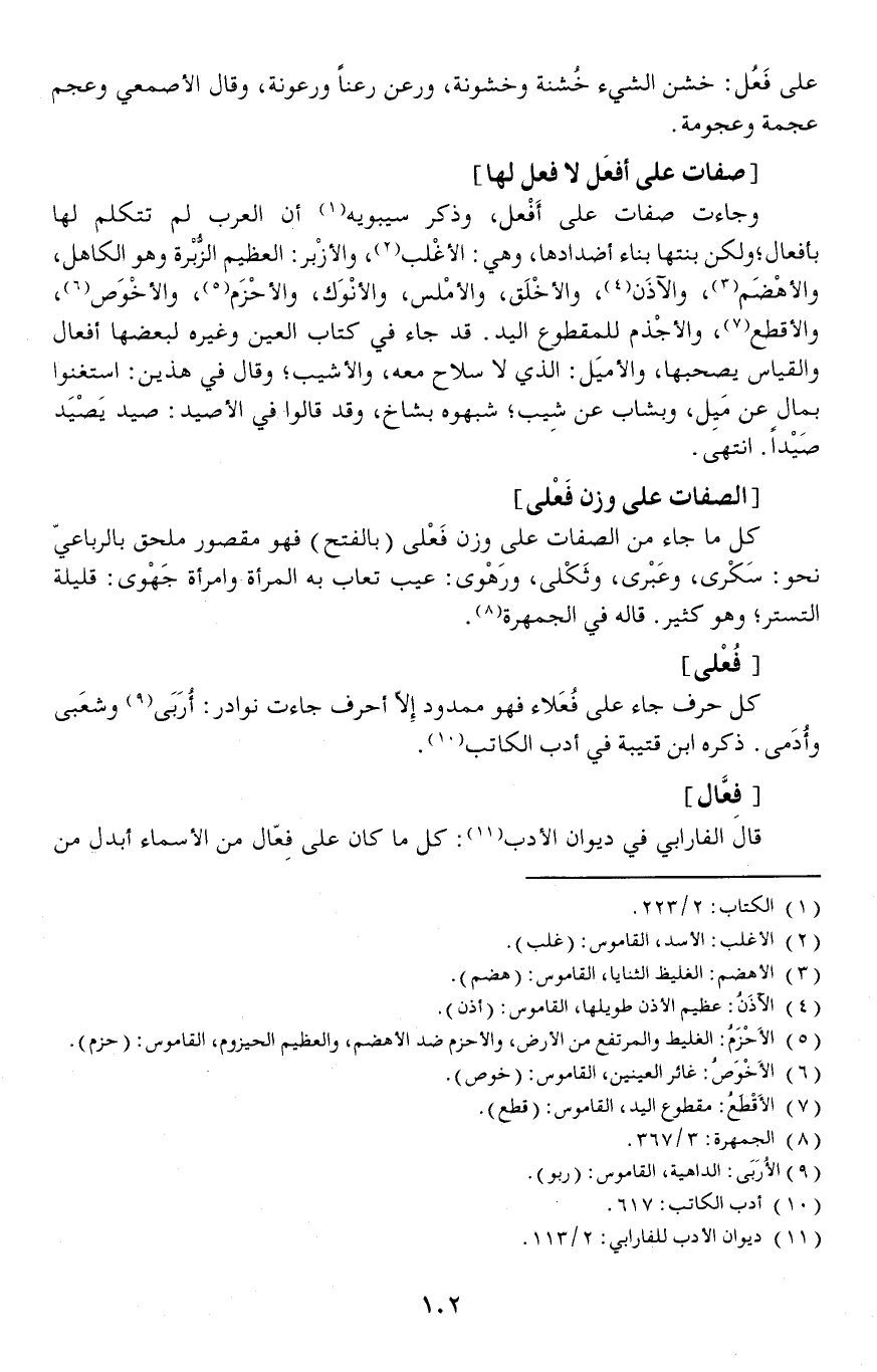 وجاءت صفات على أَفْعل، وذكر سيبويه أن العرب لم تتكلم لها بأفعال ولكن بنتها بناء أضدادها، وهي: الأغْلب، والأزْبر: العظيم الزُّبْرة وهو الكاهل، والأهْضَم، والآذَن، والأخْلَق، والأمْلس، والأنْوَك، والأحْزَم، والأخْوَص، والأقطع، والأجْذم للمقطوع اليد.