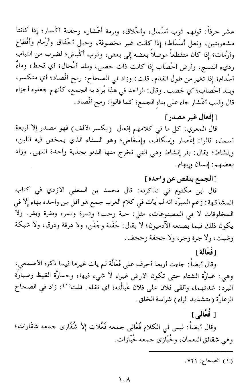 عشر حرفا: قولهم ثوب أسْمال، وأخْلاق، وبرمة أَعْشار، وجفنة أكْسار إذا كانتا مشعوبتين، ونعل أَسْمَاط إذا كانت غير مخصوفة، وحبل أحْذاق وأَرْمام وأَقْطاع وأرْماث إذا كان متقطعا موصلا بعضه إلى بعض، وثوب أَكْباش لضرب من الثياب رديى النسج، وأرض أحْصَاب إذا كانت ذات حصى، وبلد أمْحال أي قحط، وماءٌ أسْدام إذا تغير من طول القدم.