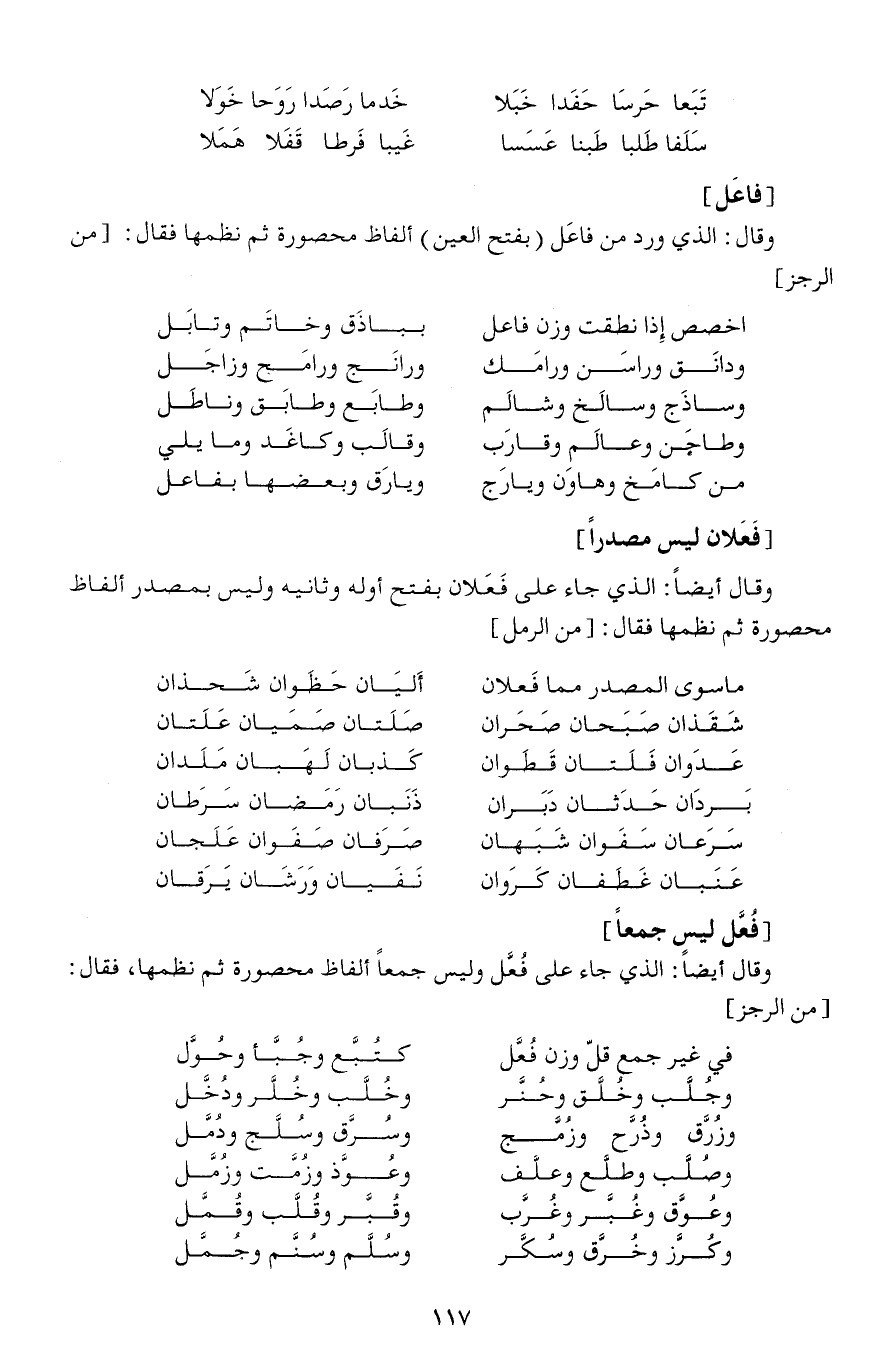 وقال: الذي ورد من فاعَل (بفتح العين) ألفاظ محصورة ثم نظمها فقال: [// من الرجز //]