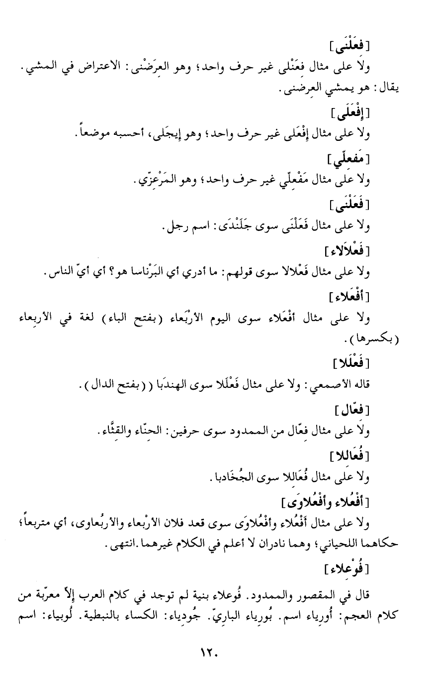 ولا على مثال أَفْعُلاء وأفْعُلاوَى سوى قعد فلان الأرْبعاء والأربُعاوى، أي متربعا حكاهما اللحياني، وهما نادران لا أعلم في الكلام غيرهما.