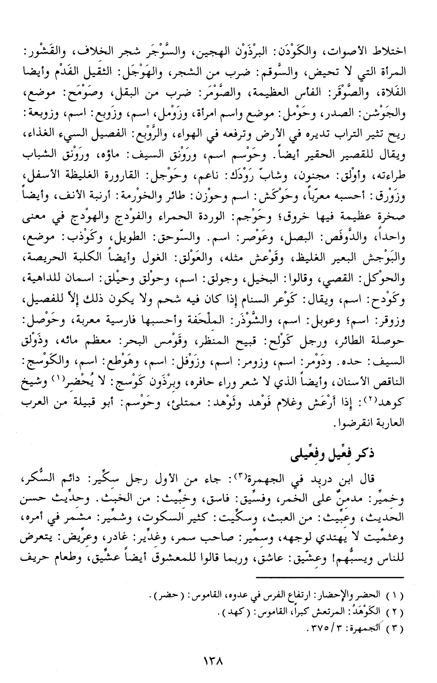 وحِدِّيث حسن الحديث، وعِبِّيث: من العبث، وسكِّيت: كثير السكوت، وشمِّير: مشمر في أمره، وعثمِّيت لا يهتدي لوجهه، وسِمِّير: صاحب سمر، وغِدِّير: غادر، وعِرِّيض: يتعرض للناس ويسبُّهم وعِشّيق: عاشق، وربما قالوا للمعشوق أيضا عشِّيق، وطعام حريف