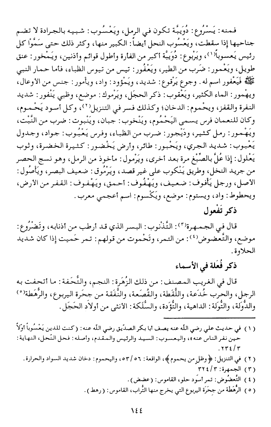 قال في الغريب المصنف: من ذلك الزُهَرة: النجم، والتُّحَفة: ما أتحفت به الرجل، والحرب خُدَعة واللُّقَطة، والقُصَعة، والنُّفَقة من جِحَرة اليربوع، والرُّهَطة والدُّوَلة، والتُّوَلة: الداهية، والتُّؤَدة، والسُّلَكة: الأنثى من أولاد الحَجَل.