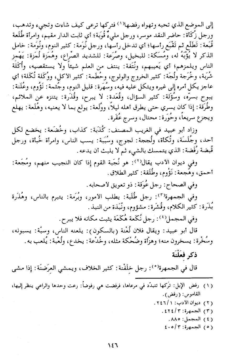 إلى الموضع الذي تحبه وتهواه رفضها فتركها ترعى كيف شاءت وتجيء وتذهب، ورجل زُكَأة: حاضر النقد موسر، ورجل مليءٌ قُوَبة أي ثابت الدار مقيم، وامرأة طُلَعة قُبَعة: تَطَلّع ثم تَقْبَع رأسها أي تدخل رأسها، ورجل نُوَمة: كثير النوم، ونُوَمة: خامل الذكر لا يُؤْبَهُ له، ومُسَكة: للبخيل، وصُرَعة: للشديد الصِّراع، وهُمَزة لُمَزة: يَهْمِز الناس ويلمزهم أي يَعيبهم، ونُتَفة: ينتف من العلم شيئا ولا يستقصيه، وأُكَلة شُرَبة، وخُرَجة ولُجَة: كثير الخروج والولوج، وحُطَمة: كثير الأكل، ووُكَلة تُكَلة أي عاجز يكل أمره إلى غيره ويتكل عليه فيه، وسُهَرة: قليل النوم، وجَُثمة: نَؤُوم، وعُلَنة: يبوح بسره، وسُؤَلة: كثير السؤال، وقُعَدة: لا يبرح، وقُذَرة: يتنزه عن الملائم، وطُرَقة: إذا كان يسري حتى يطرق أهله ليلا، ووُلَعة: يولع بما لا يعنيه، وهُلَعة: يهلع ويجزع سريعا، وحُوَرة: محتال، وسرج عُقَرة.
