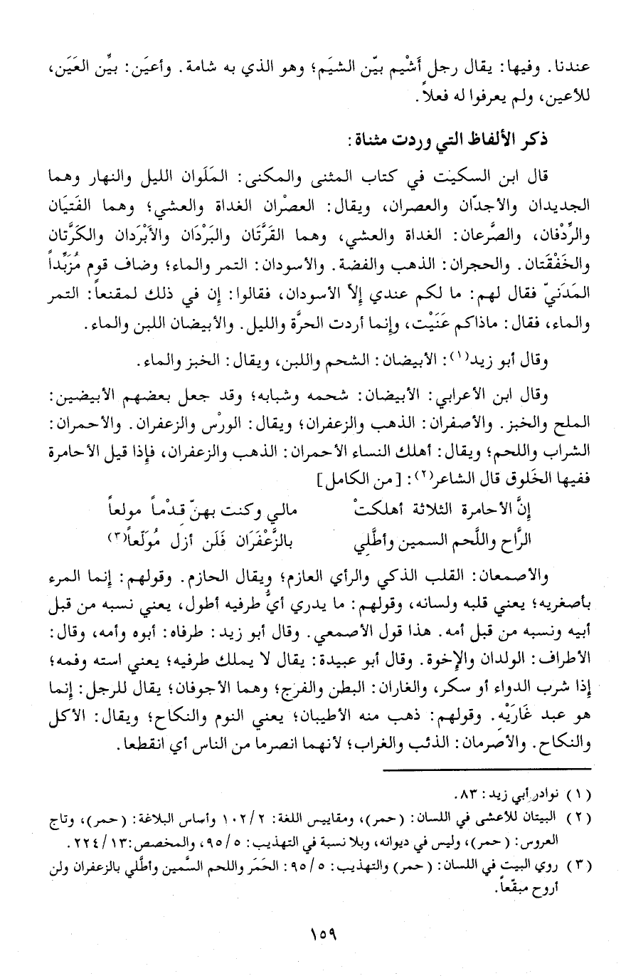 والأحمران: الشراب واللحم ويقال: أهلك النساء الأحمران: الذهب والزعفران، فإذا قيل الأحامرة ففيها الخَلوق قال الشاعر: [// من الكامل //]