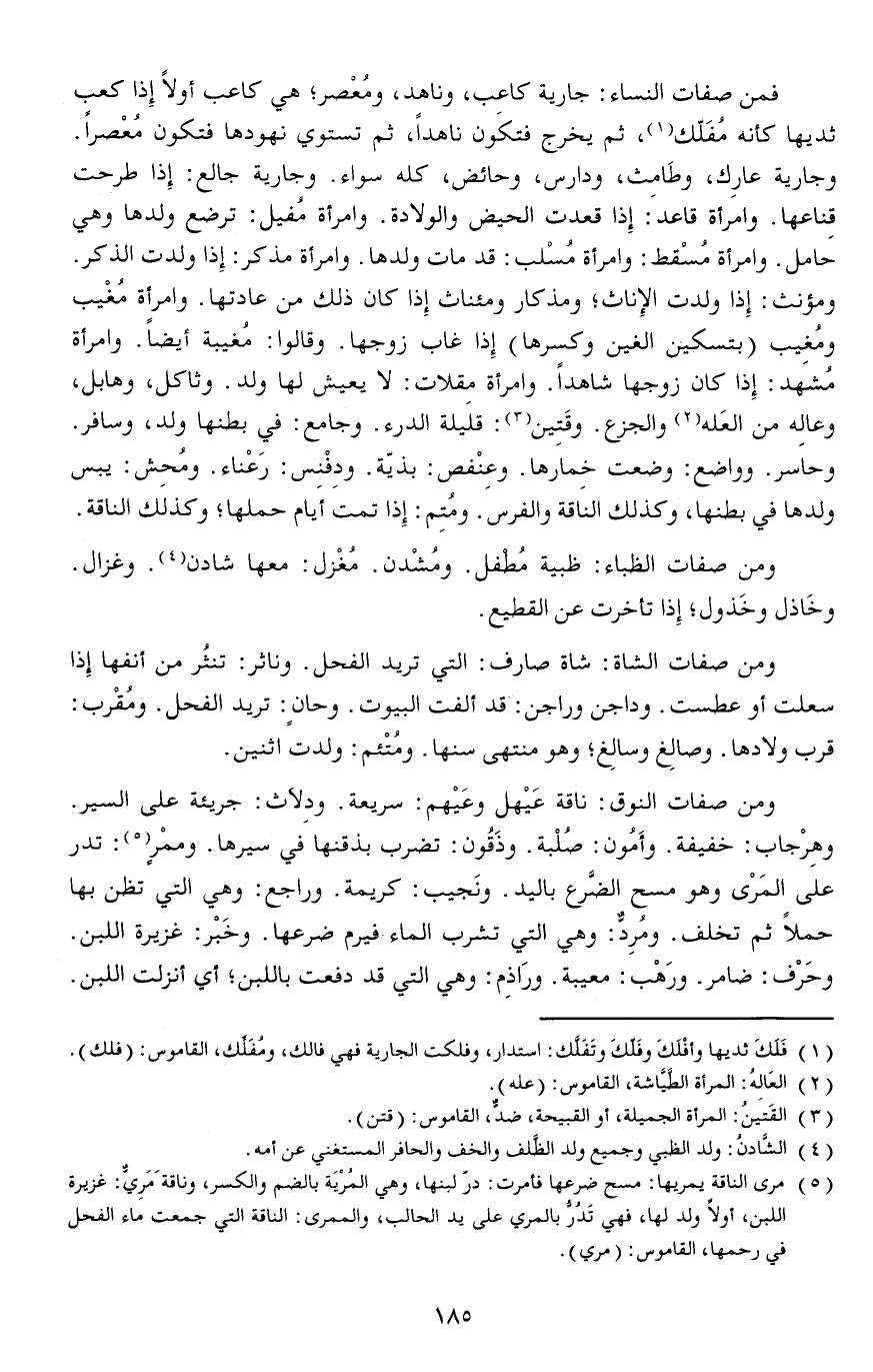 فمن صفات النساء: جارية كاعِب، وناهد، ومُعْصر هي كاعب أولا إذا كعب ثديها كأنها مُفَلّك، ثم يخرج فتكون ناهدا، ثم تستوي نهودها فتكون مُعْصراً.