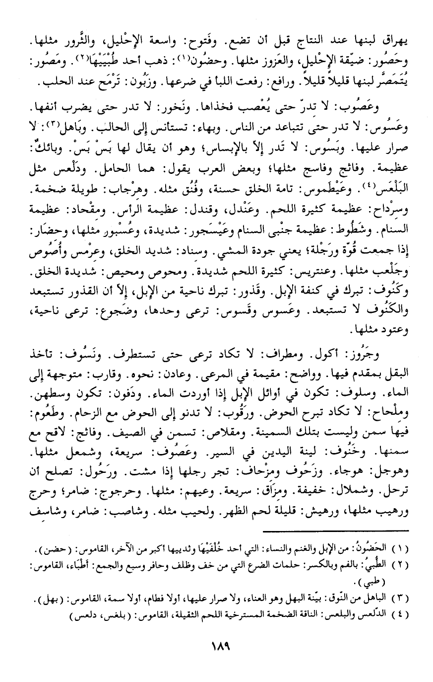 يهراق لبنها عند النتاج قبل أن تضع وفَتوح واسعة الإحْليل والثَّرور مثلها وحَصُور ضيقة الإحْليل والعَزوز مثلها وحضُون ذهب أحد طُبْيَيْهَا ومَصُور يُتَمَصَّر لبنها قليلا قليلا ورافع رفعت اللبأ في ضرعها وزَبُون تَرْمَح عند الحلب