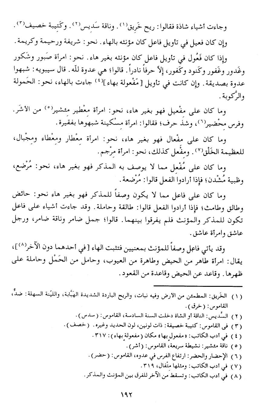 وما كان على مِفْعيل فهو بغير هاء، نحو: معطير مئشيرا من الأشَر وفرس مِحْضير وشذ حرف فقالوا امرأة مِسْكينة شبهوها بفقيرة