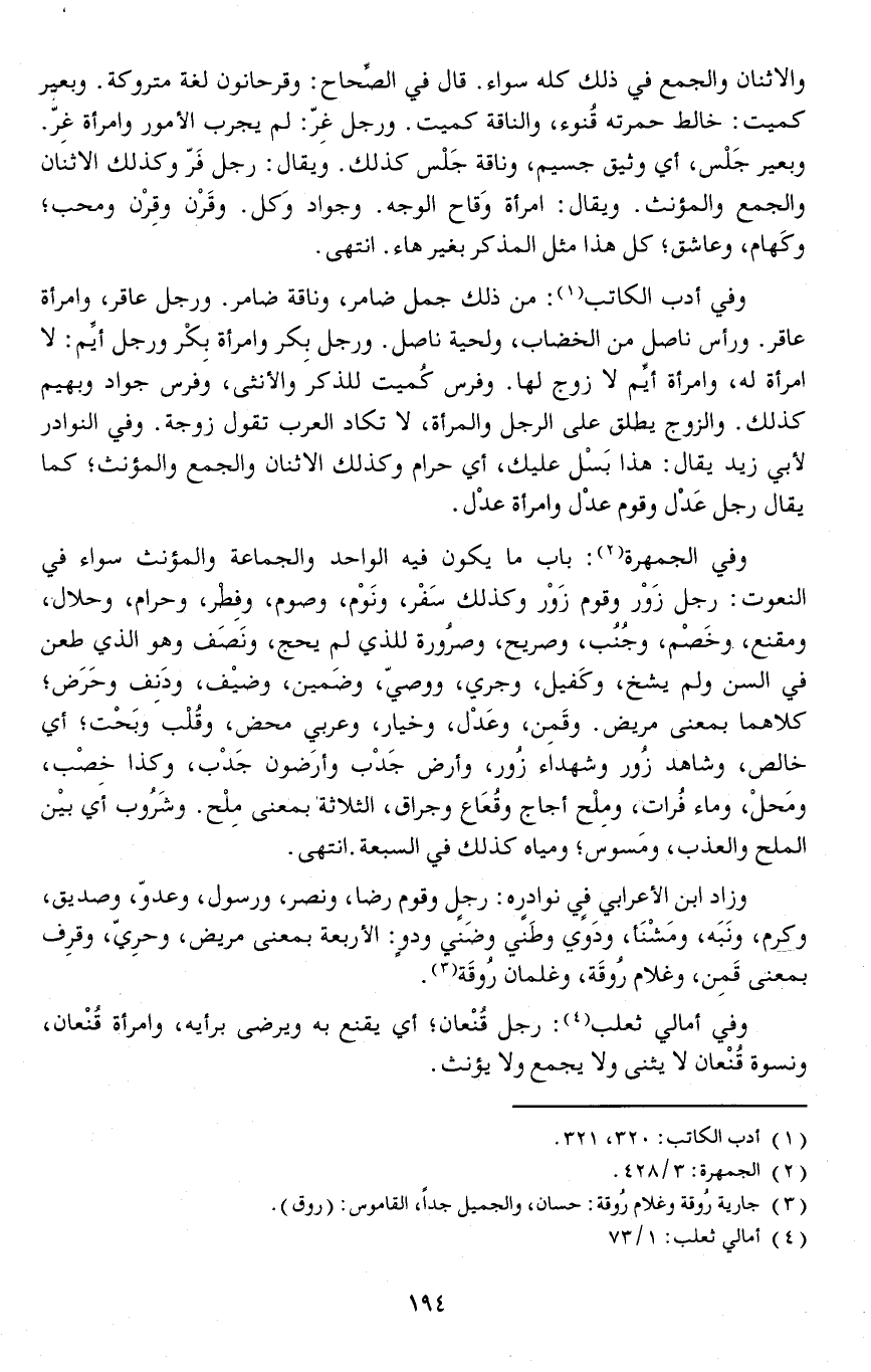 وفي الجمهرة: باب ما يكون فيه الواحد والجماعة والمؤنث سواء في النعوت: رجل زَوْر وقوم زَوْر وكذلك سَفْر، ونَوْم، وصوم، وفِطْر، وحرام، وحلال، ومقنع، وخَصْم، وجُنُب، وصريح، وصرُورة للذي لم يحج، ونَصَف وهو الذي طعن في السن ولم يشخ، وكَفيل، وجري، ووصيّ، وضَمين، وضيف، ودنف وحرضكلاهما بمعنى مريض.