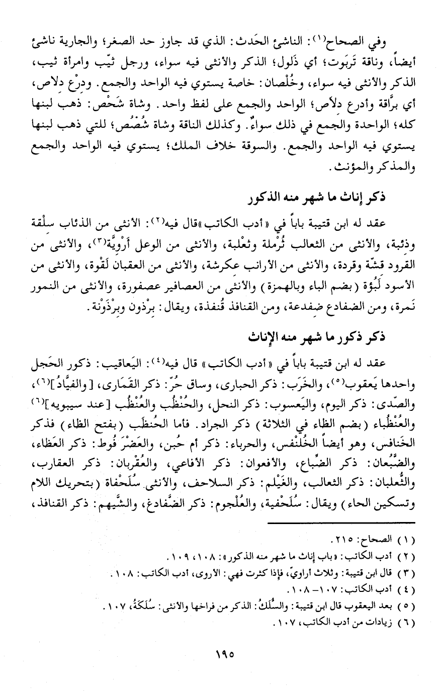 عقد له ابن قتيبة بابا في ((أدب الكاتب)) قال فيه: الأنثى من الذئاب سِلْقة وذِئبة، والأنثى من الثعالب ثُرْملة وثعْلبة، والأنثى من الوعل أَرْوِيَّة، والأنثى من القرود قِشّة وقردة، والأنثى من الأرانب عِكرشة، والأنثى من العقبان لَقْوة، والأنثى من الأسود لَبُؤة (بضم الباء وبالهمزة) والأنثى من العصافير عصفورة، والأنثى من النمور نَمرة، ومن الضفادع ضِفدعة، ومن القنافذ قُنفذة، ويقال: بِرْذون وبِرْذَوْنة.