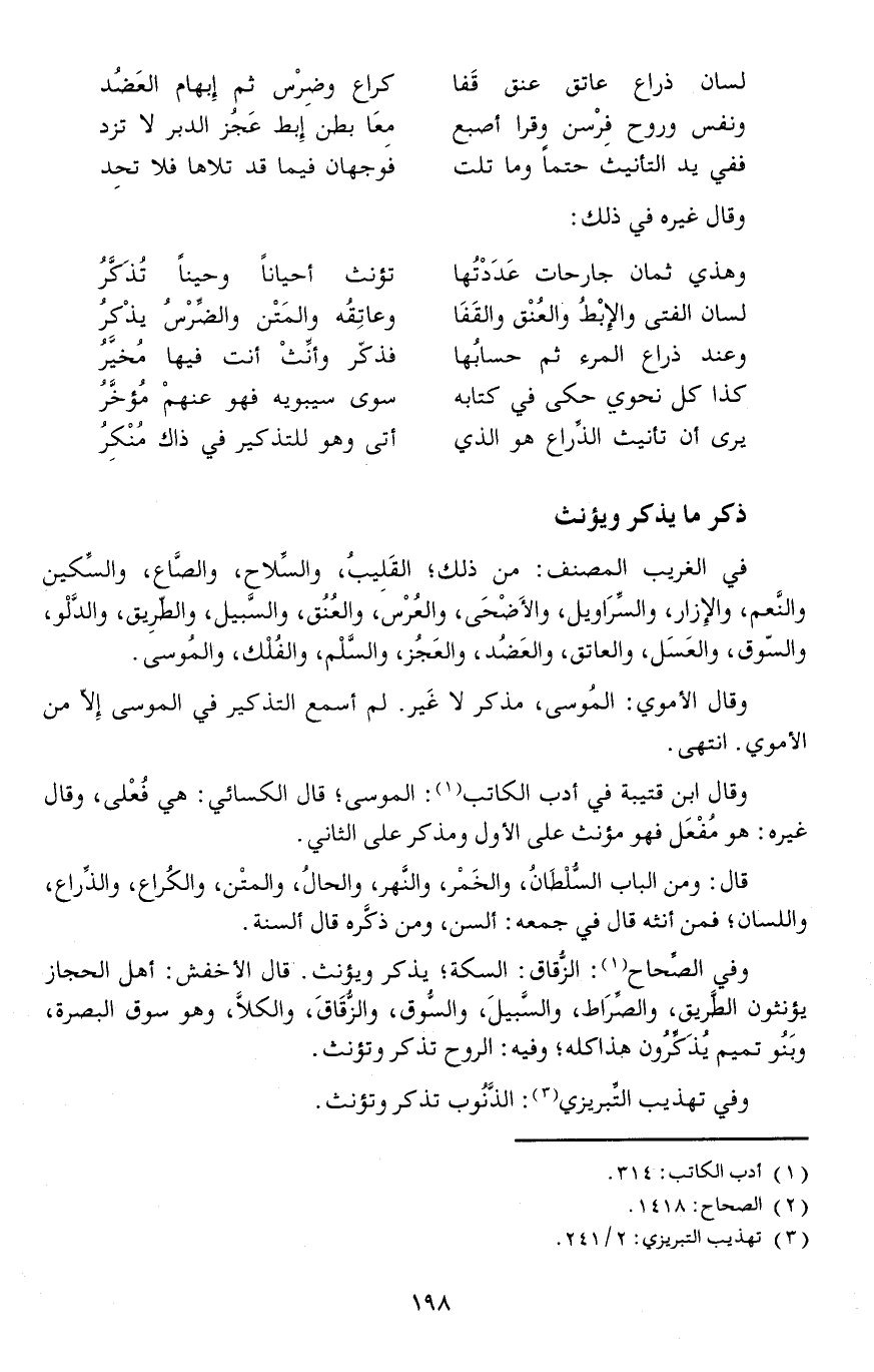 قال: ومن الباب السُّلْطَانُ، والخَمْر، والنَّهر، والحالُ، والمتْن، والكُراع، والذِّراع، واللسان فمن أنثه قال في جمعه: ألسن، ومن ذكَّره قال ألسنة.