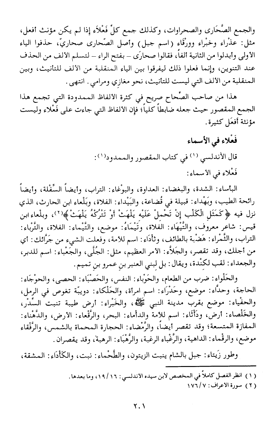 البأساء: الشدة، والبغضاء: العداوة، والبوْغاء: التراب، وأيضا السِّفْلة، وأيضا رائحة الطيب، وبَهْداء: قبيلة في قُضاعة، والبَيْداء: الفلاة، وبَلْعاء ابن الحارث، الذي نزل فيه {كَمَثَلِ الْكَلْب إنْ تَحْمِلْ عليه يلهث أو تتركه يلهث} وبلعاء ابن قيس: شاعر معروف، والتَّيْهَاء: الفلاة، وتَيْمَاءُ، موضع، والتَّيْماء: الفلاة، والتَّرْباء: التراب، والثَّمْراء: هَضْبة بالطائف، وثأْدَاء: اسم للأمة، وفعلت الشيء من جَرَّائك: أي من أجلك، وقد تقصر، والجَلاَّء: الأمر العظيم، مثل: الجُلَّى، والجَعْباء: اسم للدبر، والجعداء: لقب لكِنْدة، ويقال: بل لِبني العنبر بنِ عمرو بنِ تميم.