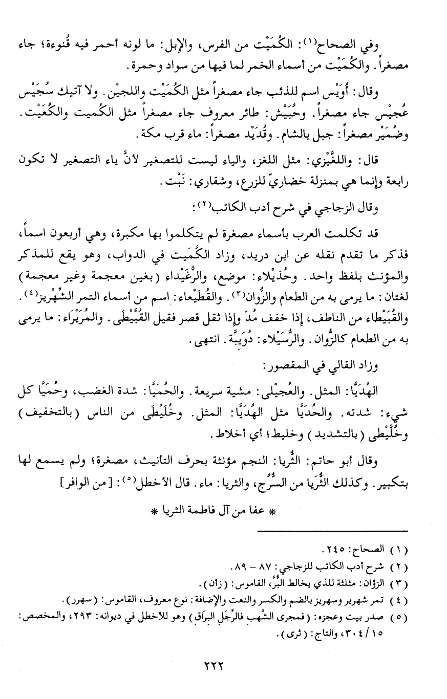 قد تكلمت العرب بأسماء مصغرة لم يتكلموا بها مكبرة، وهي أربعون اسما، فذكر ما تقدم نقله عن ابن دريد، وزاد الكُمَيت في الدواب، وهو يقع للمذكر والمؤنث بلفظ واحد.
