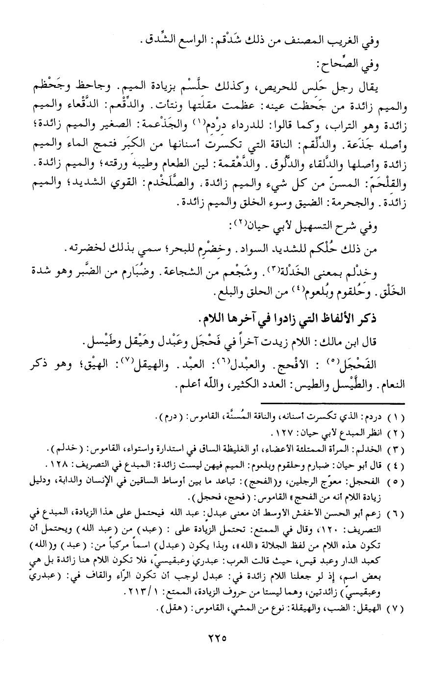 قال ابن مالك: اللام زيدت آخرا في فَحْجَل وعَبْدل وهَيْقل وطَيْسل.