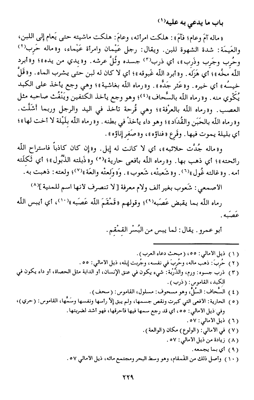 ((ماله آمَ وعام فآمَ)) : هلكت امرأته، وعامَ: هلكت ماشيته حتى يعام إلى اللبن، والعميمة: شدة الشهوة للبن.