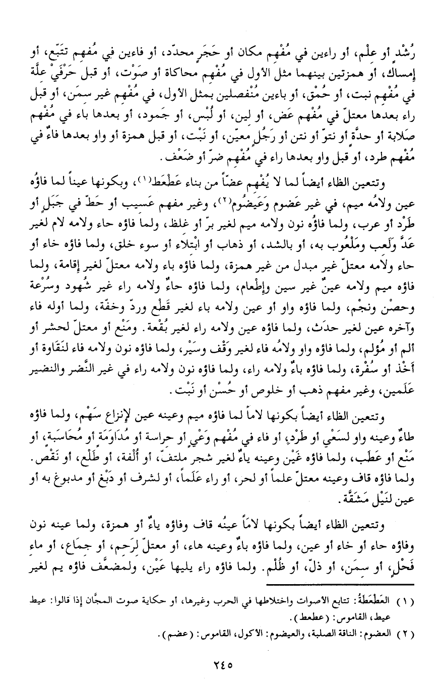 وتتعين الظاء أيضا لما لا يُفْهِم عضا من بناء عَطْعَط، وبكونها عينا لما فاؤُه عين ولامُه ميم، في غير عَضوم وَعَيضُوم، وغير مفهم عَسِيب أو حَطّ في جَبَلٍ أو طَرْد أو عرب، ولما فاؤُه نون ولامه ميم لغير بر أو غِلظ، ولما فاؤه حاء ولامه لام لغير عَدَّ وَلَعِب ومَلْعُوب به، أو بالشد، أو ذهاب أو ابْتِلاء أو سوء خلق، ولما فاؤه خاء أو حاء ولامه معتل غير مبدل من غير همزة، ولما فاؤه باء ولامه معتل لغير إقامة، ولما فاؤه ميم ولامه عينٌ غير سين وإطْعام، ولما فاؤه حاءٌ ولامه راء غير شُهود وسُرْعة وحصْن ونجْم، ولما فاؤه واو أو عين ولامه باء لغير قَطْع ورد وخفة، ولما أوله فاء وآخره عين لغير حدَث، ولما فاؤه عين ولامه راء لغير بُقْعة.