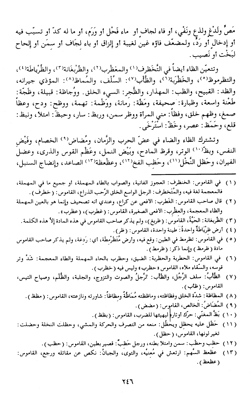 وتتعيّن الظاء أيضاً في التخظرف والمغظرب، والظّرْبغَانة، والظِّرْياطَة، والتظرموظ، والخَظْرَبة، والظَّأْب، السِّلْف، والمُماظ، المؤذي جيرانه، والظد: القبيح، والظب: المهذار، والظَّجِر: السيء الخلق.