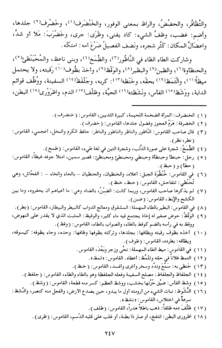 والتَّظَافُر، والحضُضُ، والراظ بمعنى الوفور، والخَنْضَرف، وخَضْرف، جلدها، وأَضِم: غضب، وظفَّ الشيء: كاد يفنى، وظرى: جرى، وخضرب: ملأ أو سد، واعضَألَّ المكان: كَثُر شجره، ونَضف الفصيلُ ضَرْعَ أمه: امتكه.
