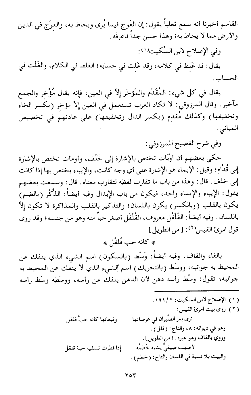 وفيه أيضا: الفُلْفُل معروف، القُلْقُل أصغر حبا منه وهو من جنسه وقد روى قول امرىء القيس: [// من الطويل //]