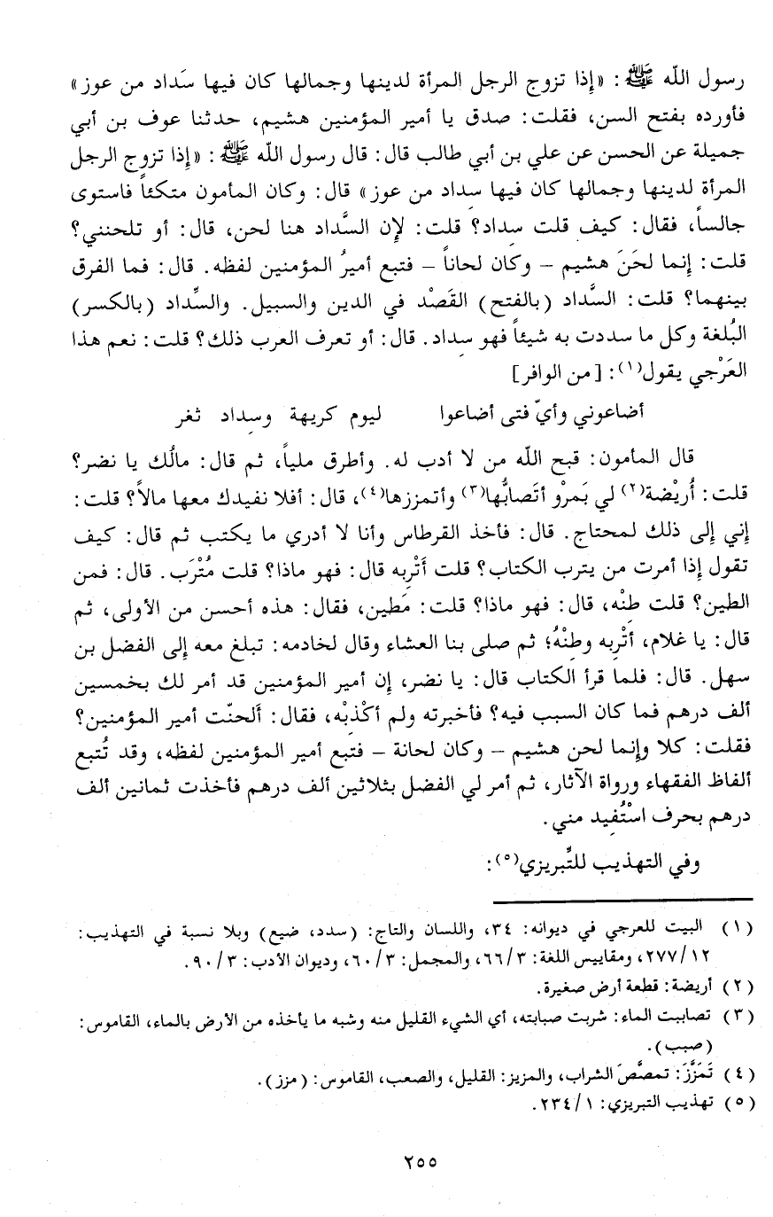 رسول الله صلى الله عليه وسلم: (إذا تزوج الرجل المرأة لدينها وجمالها كان فيها سَداد من عوز) فأورده بفتح السن، فقلت: صدق يا أمير المؤمنين هشيم، حدثنا عوف بن أبي جميلة عن الحسن عن علي بن أبي طالب قال: قال رسول الله صلى الله عليه وسلم (إذا تزوج الرجل المرأة لدينها وجمالها كان فيها سداد من عوز) قال: وكان المأمون متكئا فاستوى جالسا، فقال: كيف قلت سِداد قلت: لإن السَّداد هنا لحن، قال: أو تلحنني قلت: إنما لحَنَ هشيم - وكان لحانا - فتبع أميرُ المؤمنين لفظه.
