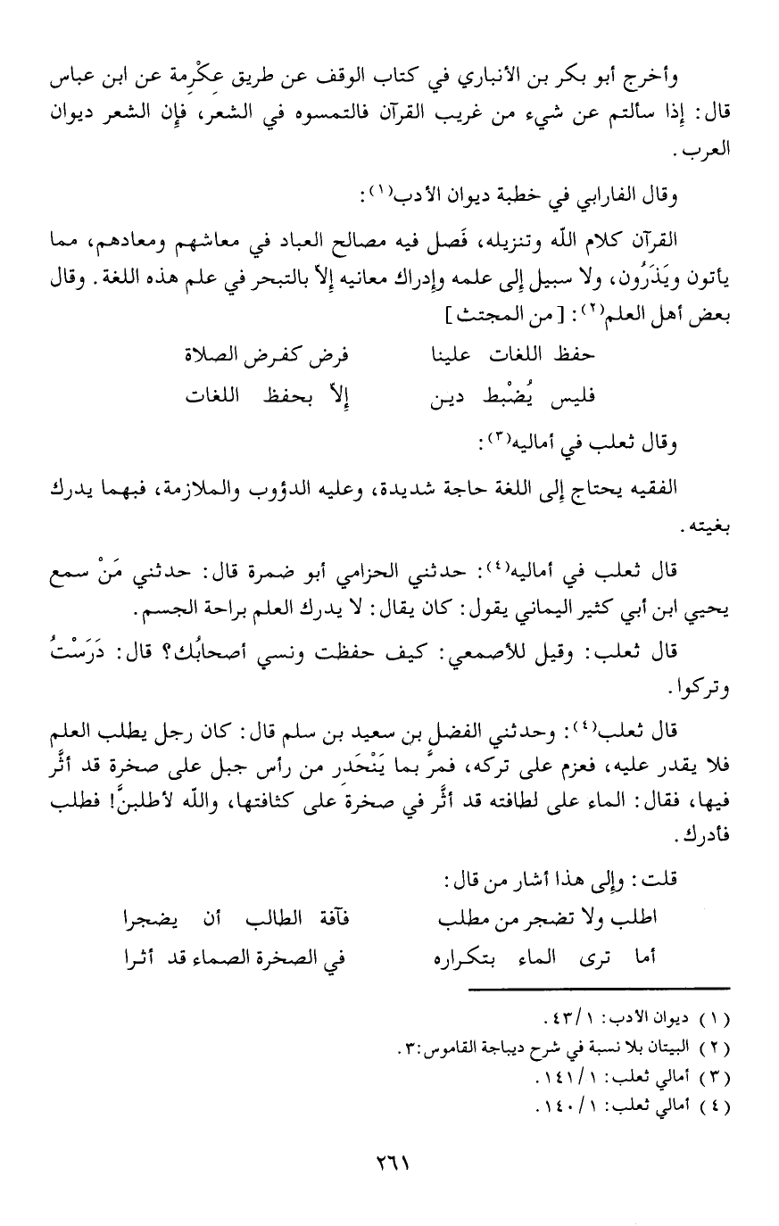 (فليس يُضْبط دين ... إلا بحفظ اللغات) وقال ثعلب في أماليه: الفقيه يحتاج إلى اللغة حاجة شديدة، وعليه الدؤوب والملازمة، فبهما يدرك بغيته.