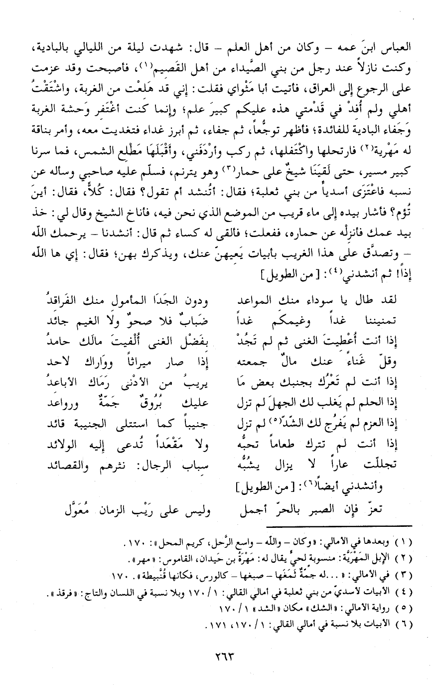 العباس ابنَ عمه - وكان من أهل العلم - قال: شهدت ليلة من الليالي بالبادية، وكنت نازلا عند رجل من بني الصَّيداء من أهل القَصِيم، فأصبحت وقد عزمت على الرجوع إلى العراق، فأتيت أبا مَثْواي فقلت: إني قد هَلِعْت من الغربة، واشْتَقْتُ أهلي ولم أُفِدْ في قَدْمتي هذه عليكم كبيرَ علم وإنما كنت أغْتَفِر وَحشة الغربة وَجَفاء البادية للفائدة فأظهر توجُّعاً، ثم جفاء، ثم أبرز غداء فتغديت معه، وأمر بناقة له مَهْرية فارتحلها واكْتَفلها، ثم ركب وأرْدَفَني، وأَقْبَلَهَا مَطْلِع الشمس، فما سرنا كبير مسير، حتى لَقِِيَنَا شيخٌ على حمار وهو يترنم، فسلم عليه صاحبي وسأله عن نسبه فاعْتَزَى أسديا من بني ثعلبة فقال: أتُنشد أم تقول فقال: كُلاًّ، فقال: أينَ تُؤم فأشار بيده إلى ماء قريب من الموضع الذي نحن فيه، فأناخ الشيخ وقال لي: خذ بيد عمك فأنزِلْه عن حماره، ففعلت فألقى له كساء ثم قال: أنشدنا - يرحمك الله - وتصدَّق على هذا الغريب بأبيات يَعِيهنّ عنك، ويذكرك بهن فقال: إي ها الله إذاً ثم أنشدني: [// من الطويل //]