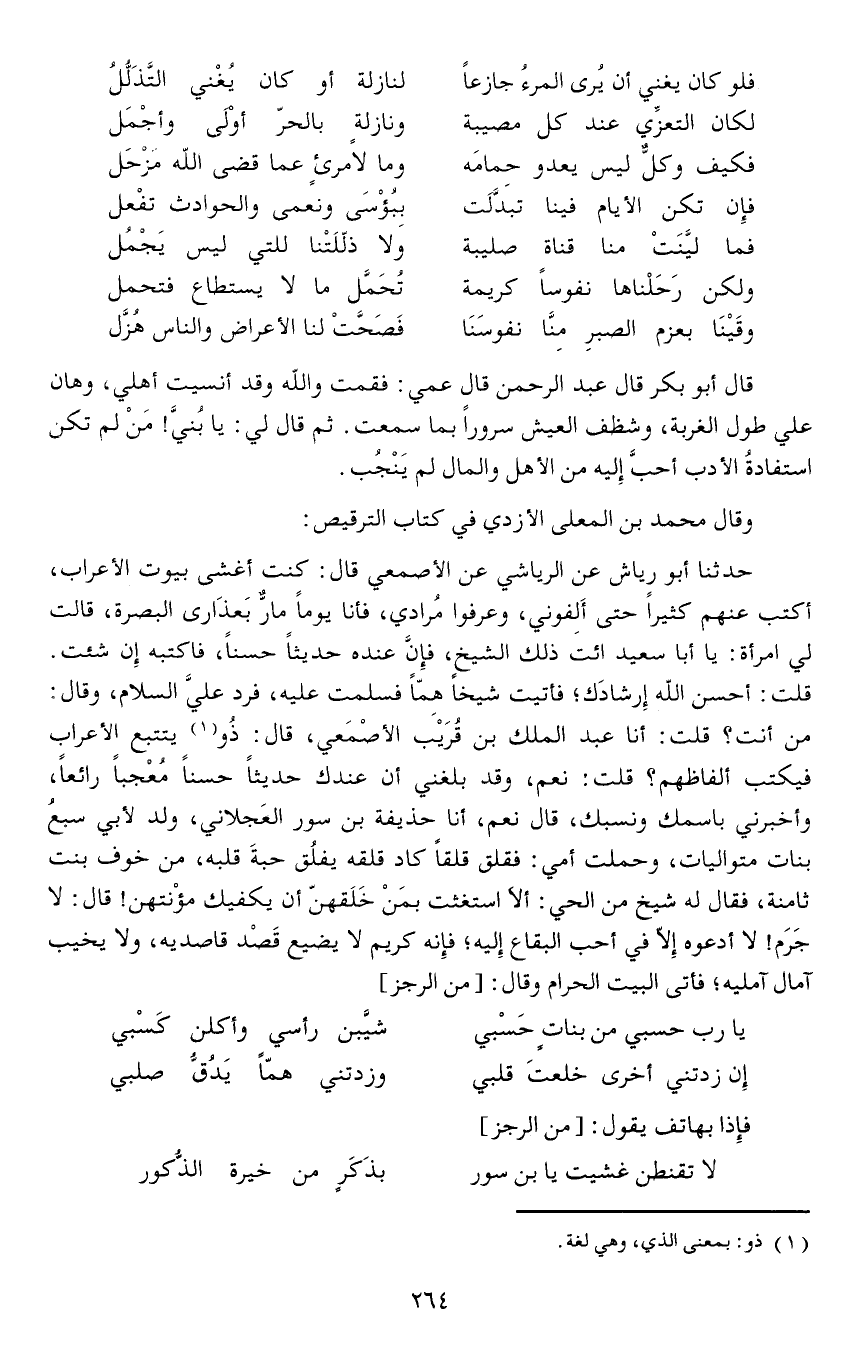 قلت: أحسن الله إرشادَك فأتيت شيخا هِمّاً فسلمت عليه، فرد عليَّ السلام، وقال: من أنت قلت: أنا عبد الملك بن قُرَيْب الأصْمَعي، قال: ذُو يتتبع الأعراب فيكتب ألفاظهم قلت: نعم، وقد بلغني أن عندك حديثا حسنا مُعْجباً رائعا وأخبرني باسمك ونسبك، قال نعم، أنا حذيفة بن سور العَجلاني، ولد لأبي سبعُ بنات متواليات، وحملت أمي: فقلق قلقا كاد قلقه يفلُق حبةَ قلبه، من خوف بنت ثامنة، فقال له شيخ من الحي: ألاَ استغثت بمَنْ خَلَقهنّ أن يكفيك مؤْنتهن قال: لا جَرَم لا أدعوه إلا في أحب البقاع إليه فإنه كريم لا يضيع قَصْد قاصديه، ولا يخيب آمال آمليه فأتى البيت الحرام وقال: [// من الرجز //]