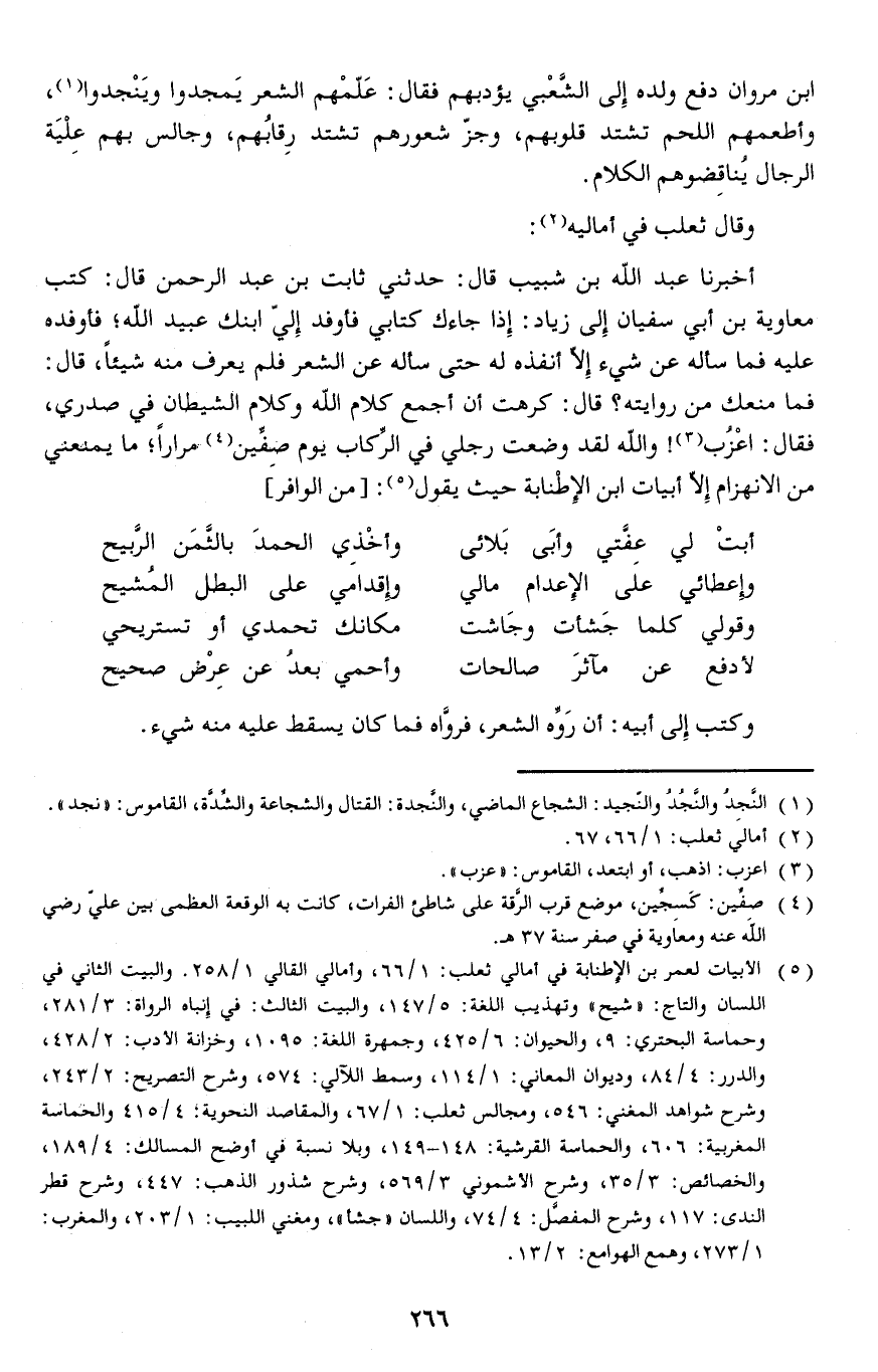 ابن مروان دفع ولده إلى الشَّعْبي يؤدبهم فقال: عَلّمْهم الشعر يَمجدوا ويَنْجدوا، وأطعمهم اللحم تشتد قلوبهم، وجز شعورهم تشتد رِقابُهم، وجالس بهم عِلْيَة الرجال يُناقِضوهم الكلام.