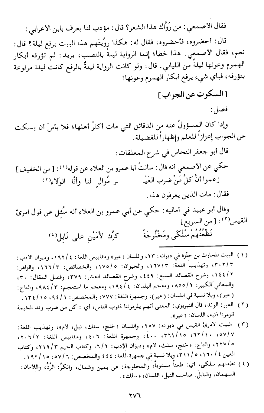 حكي عن الأصمعي أنه قال: سألتُ أبا عمرو بن العلاء عن قوله: [// من الخفيف //]