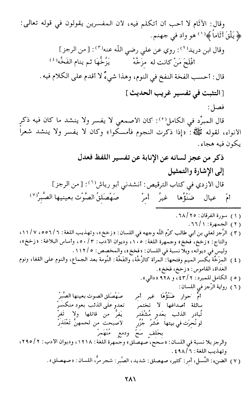فصل: قال المبرِّد في الكامل: كان الأصمعي لا يفسر ولا ينشد ما كان فيه ذكر الأنواء، لقوله صلى الله عليه وسلم ((إذا ذكرت النجوم فأَمسكوا)) وكان لا يفسر ولا ينشد شعرا يكون فيه هجاء.