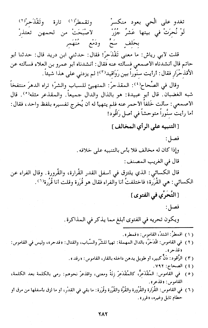 قلت لأبي رياش: ما معنى تَقْذَحِرّ فقال: حدثني ابن دريد قال: حدثنا أبو حاتم قال أنشدناه الأصمعي فسألته عنه فقال: أنشدناه أبو عمرو بن العلاء فسألته عن الاْقذِحْرَارِ فقال: أرأيت سِنّوراً بين رَوَاقِيد لم يزدني على هذا شيئا.