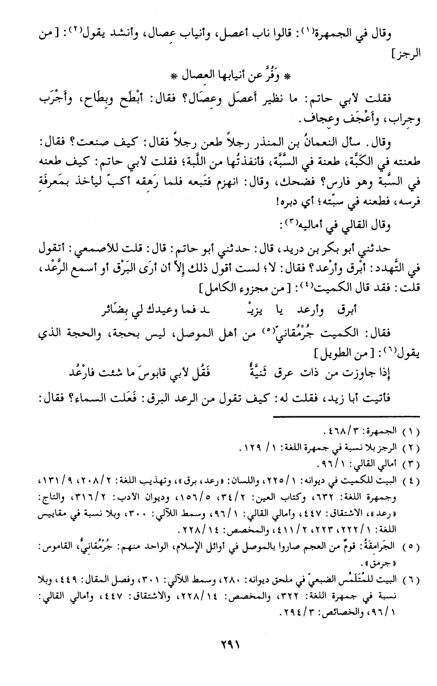 وقال القالي في أماليه: حدثني أبو بكر بن دريد، قال: حدثني أبو حاتم: قال: قلت للأصمعي: أتقول في التَّهدد: أبْرق وأرْعد فقال: لا لست أقول ذلك إلا أن أرَى البَرْق أو أسمع الرَّعْد، قلت: فقد قال الكميت: [من // مجزوء الكامل //]