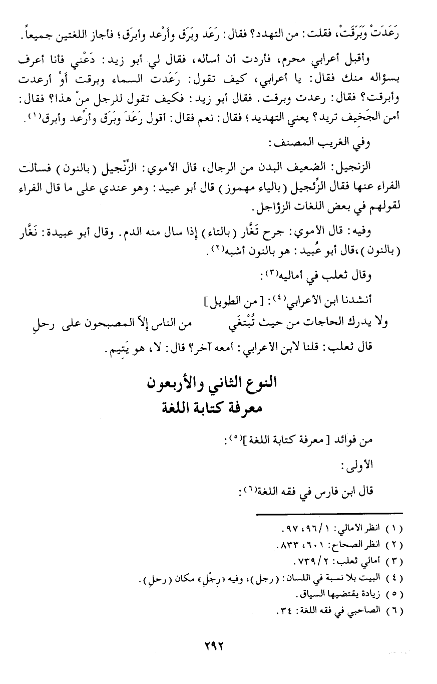 وأقبل أعرابي محرم، فأردت أن أسأله، فقال لي أبو زيد: دَعْني فأنا أعرف بسؤاله منك فقال: يا أعرابي، كيف تقول: رَعَدت السماء وبرقت أَوْ أرعدت وأبرقت فقال: رعدت وبرقت.