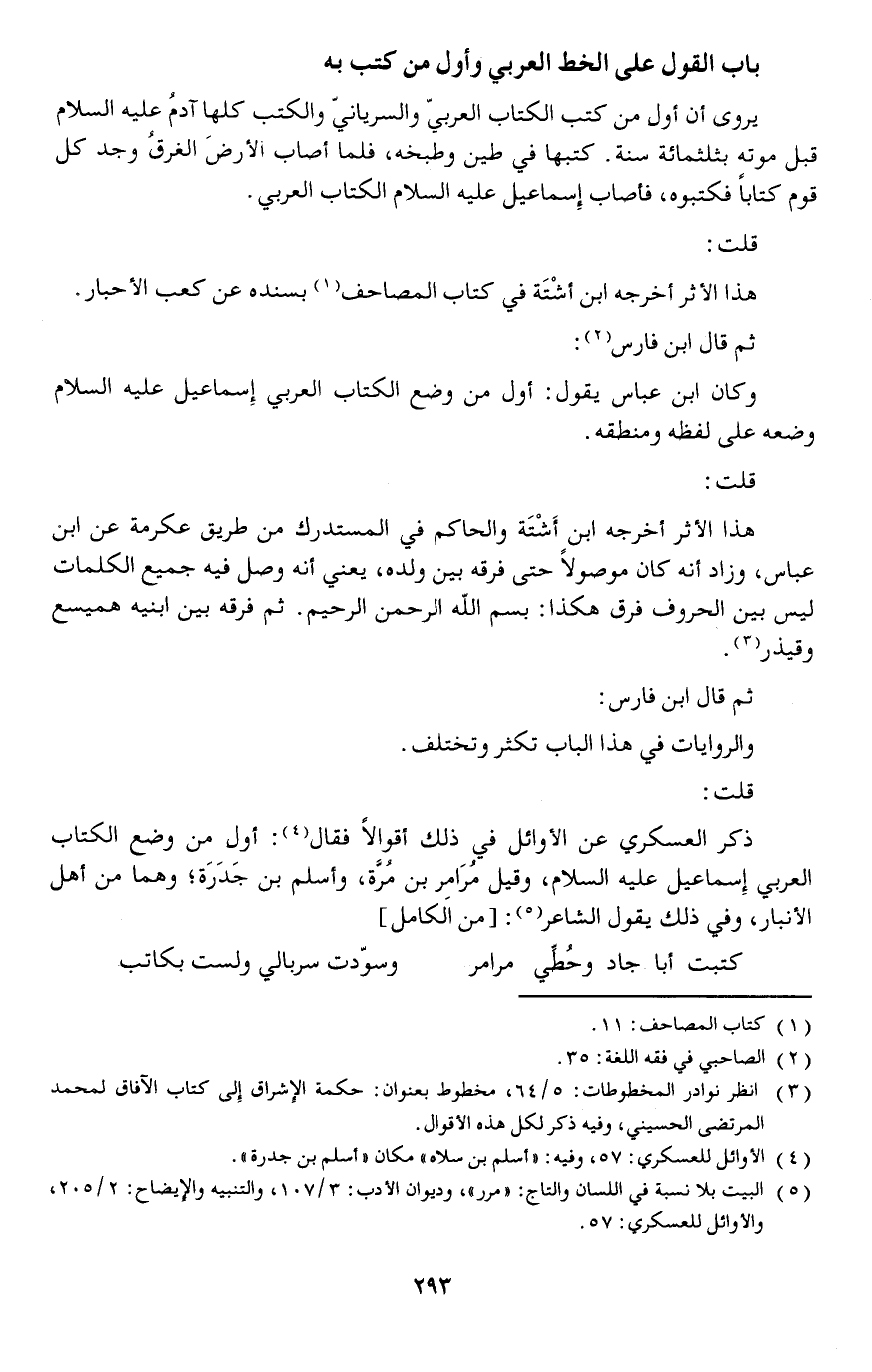 قلت: ذكر العسكري عن الأوائل في ذلك اقوالا فقال: أول من وضع الكتاب العربي إسماعيل عليه السلام، وقيل مُرَامِر بن مُرَّة، وأسلم بن جَدَرَة وهما من أهل الأنبار، وفي ذلك يقول الشاعر: [// من الكامل //]