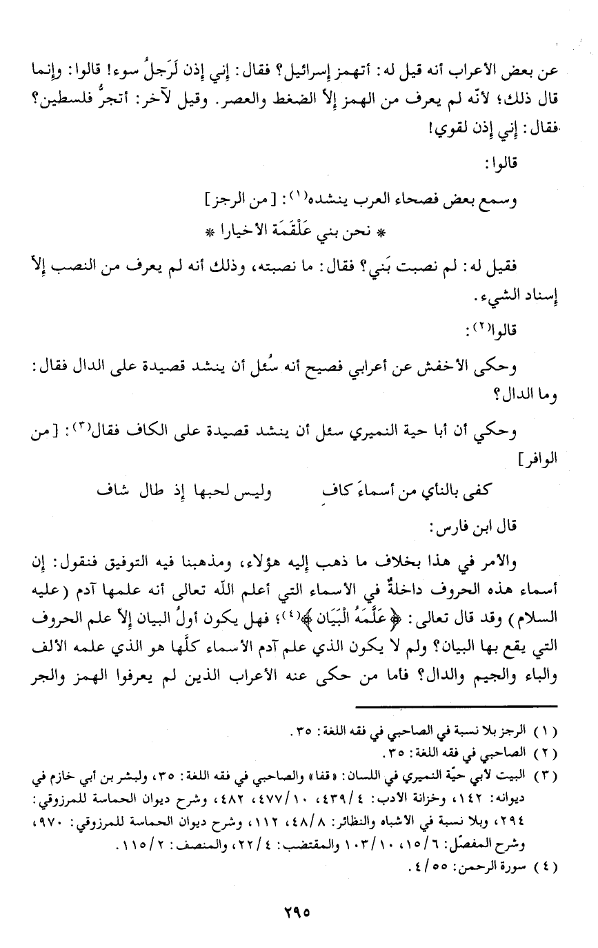 قال ابن فارس: والأمر في هذا بخلاف ما ذهب إليه هؤلاء، ومذهبنا فيه التوفيق فنقول: إن أسماء هذه الحروف داخلةٌ في الأسماء التي أعلم الله تعالى أنه علمها آدم (عليه السلام) وقد قال تعالى {عَلَّمَهُ الْبَيَان} فهل يكون أولُ البيان إلا علم الحروف التي يقع بها البيان ولم لا يكون الذي علم آدم الأسماء كلَّها هو الذي علمه الألف والباء والجيم والدال فأما من حكى عنه الأعراب الذين لم يعرفوا الهمز والجر