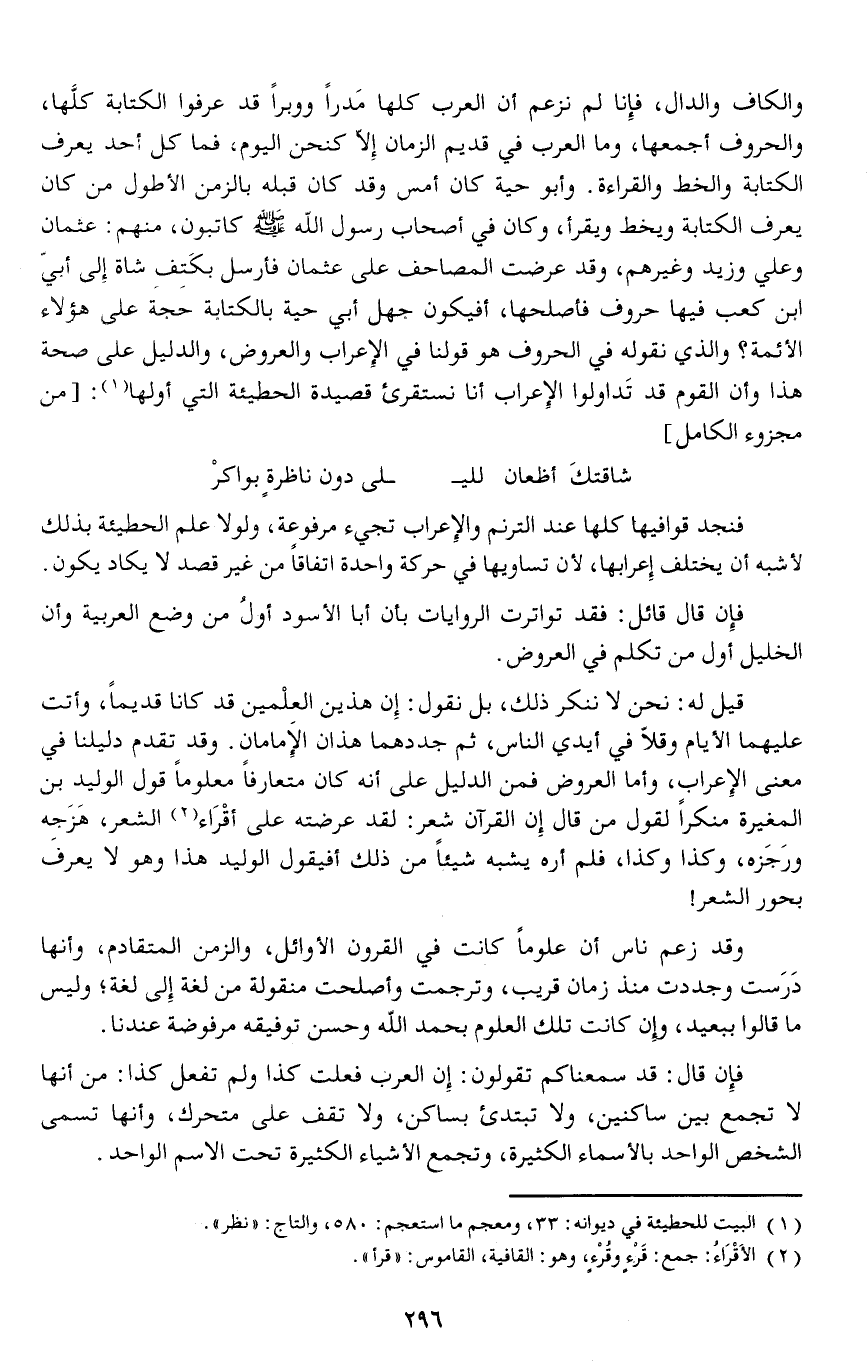 وأبو حية كان أمس وقد كان قبله بالزمن الأطول من كان يعرف الكتابة ويخط ويقرأ، وكان في أصحاب رسول الله صلى الله عليه وسلم كاتبون، منهم: عثمان وعلي وزيد وغيرهم، وقد عرضت المصاحف على عثمان فأرسل بكَتِفِ شاة إلى أبي ابن كعب فيها حروف فأصلحها، أفيكون جهل أبي حية بالكتابة حجة على هؤلاء الأئمة والذي نقوله في الحروف هو قولنا في الإعراب والعروض، والدليل على صحة هذا وأن القوم قد تَداولوا الإعراب أنا نستقرىء قصيدة الحطيئة التي أولها: [// من مجزوء الكامل //]